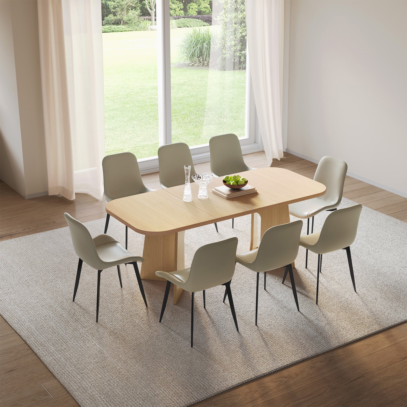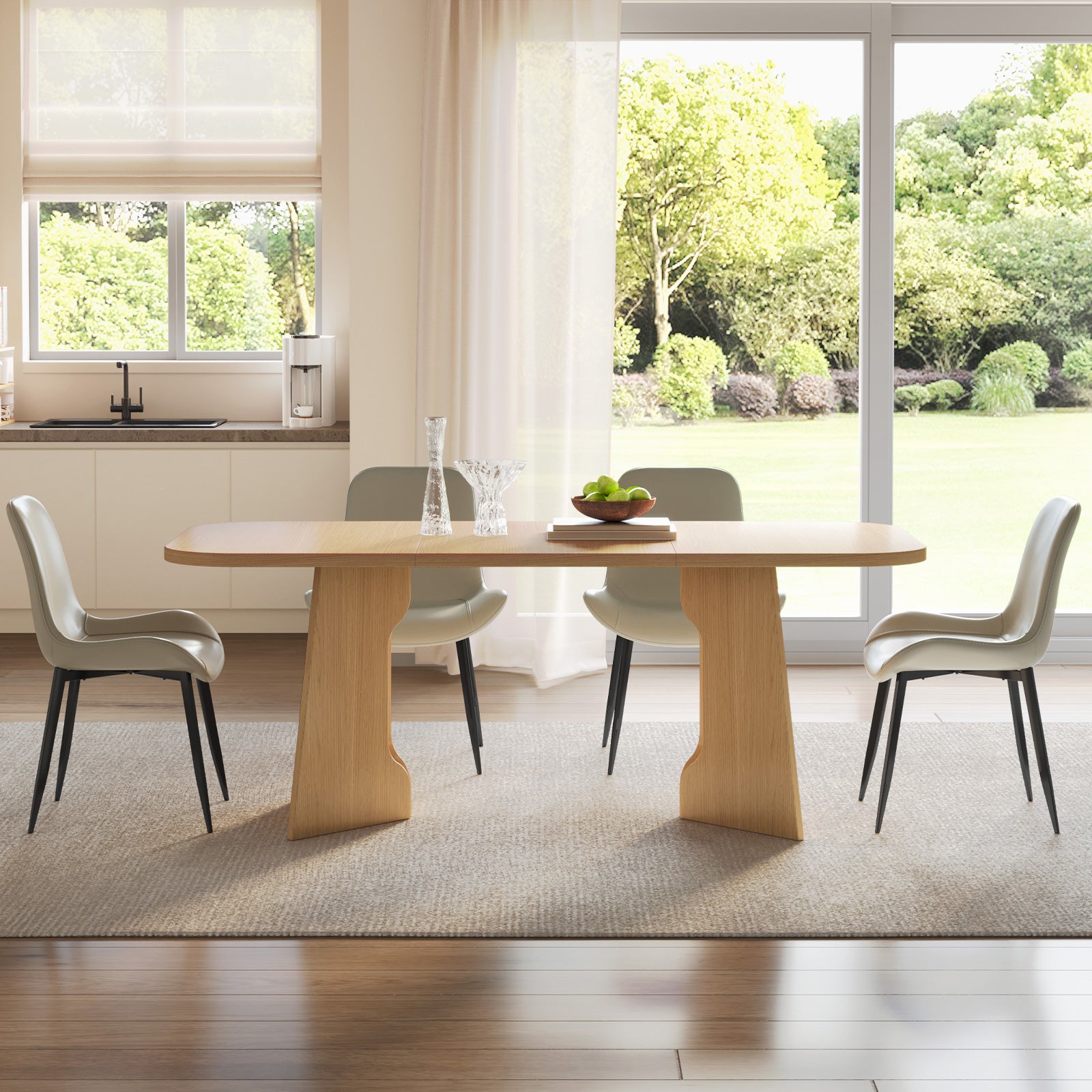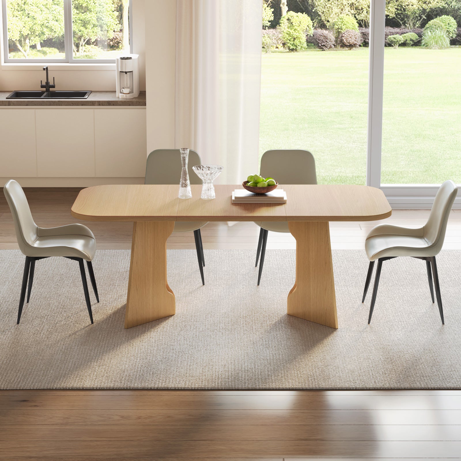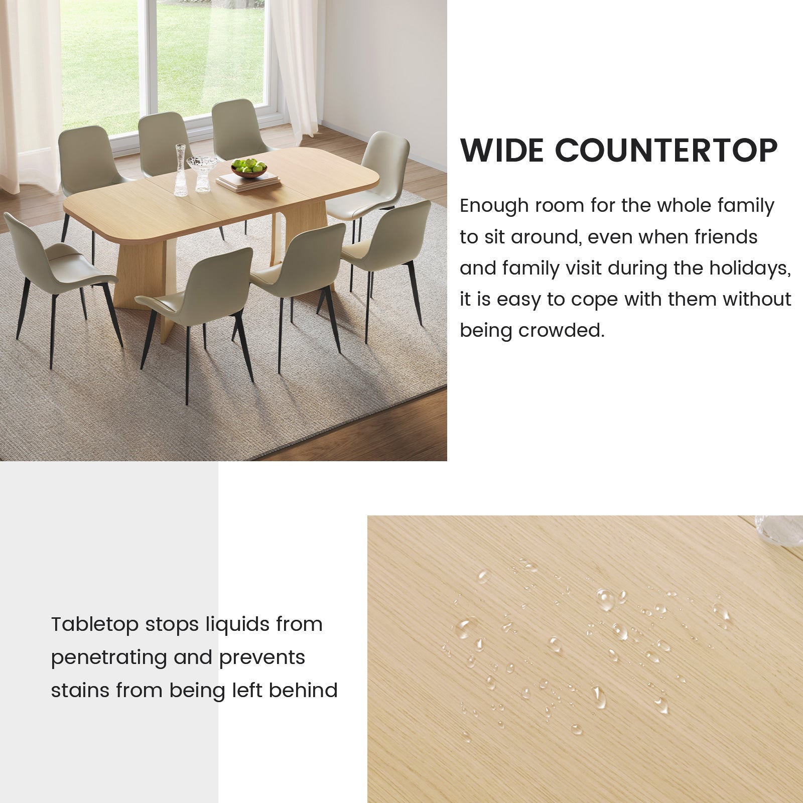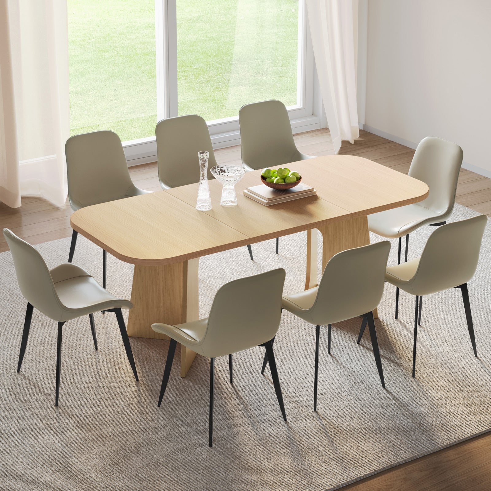 The natural wood finish and clean lines create a farmhouse aesthetic that blends rustic warmth with modern sophistication. Paired with 4-8 upholstered chairs, this dining set offers soft, breathable cushions for superior comfort, ideal for long conversations and mealtime enjoyment.