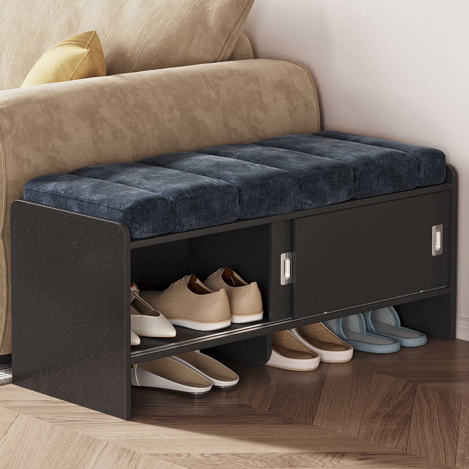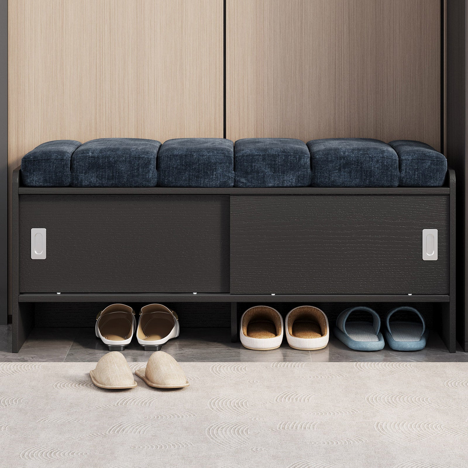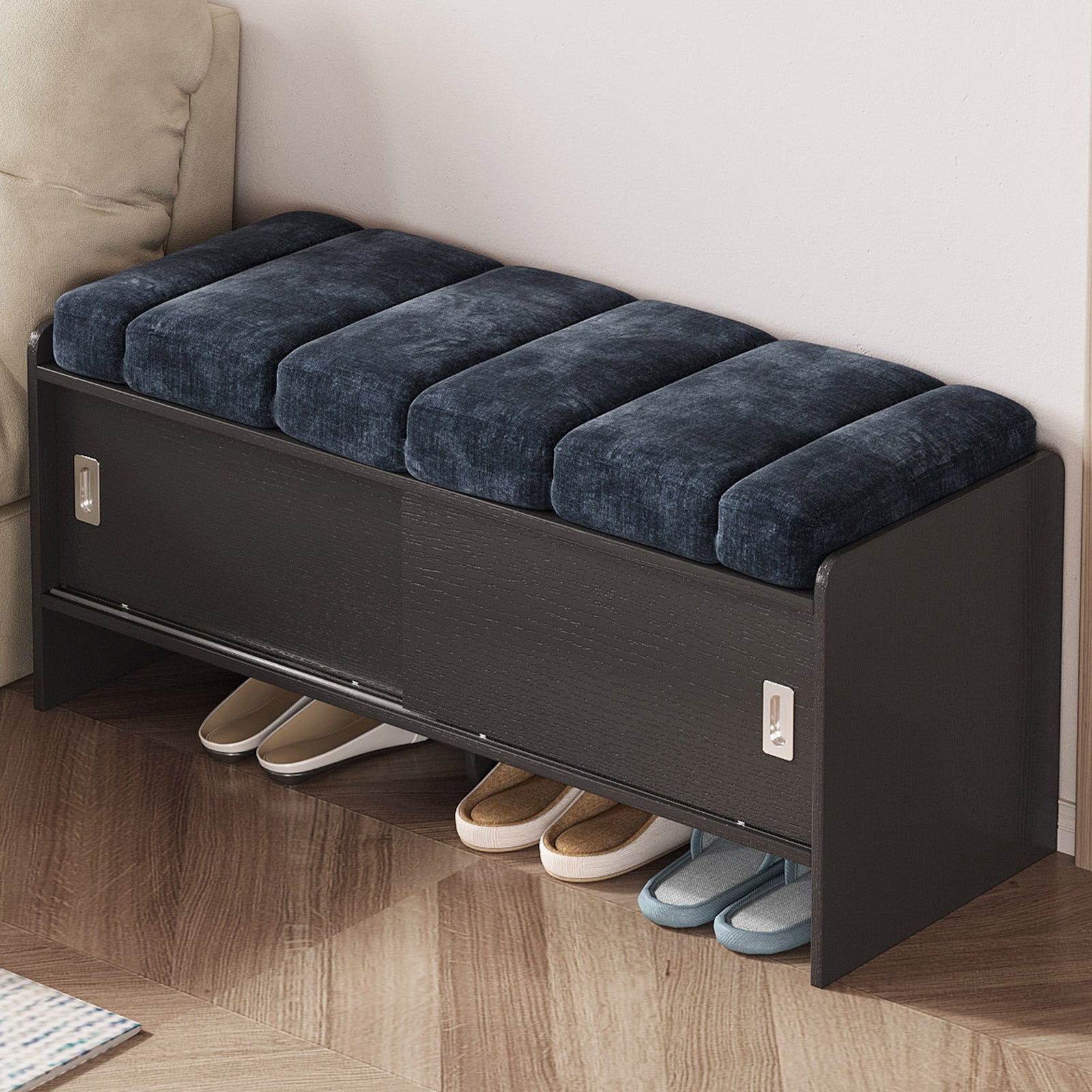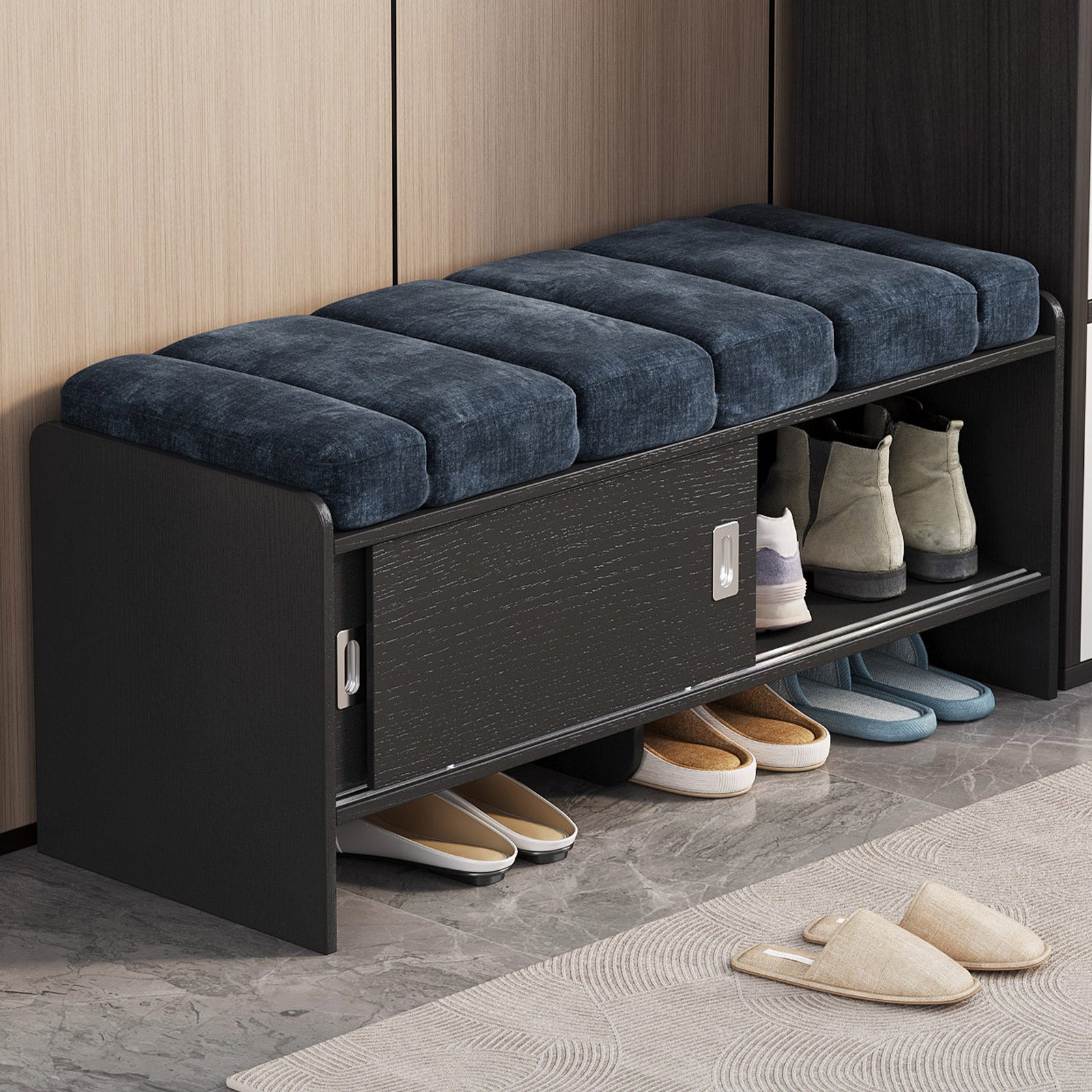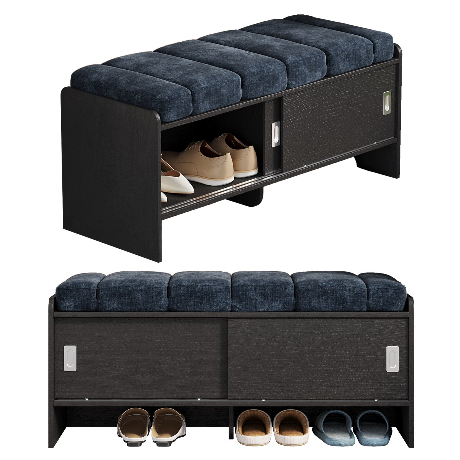 Bring comfort and organization to your home with the Guyii Modern Shoe Storage Bench. Featuring a navy blue and black finish, this 43.3" entryway organizer offers hidden and open compartments, a soft cushioned seat, and sturdy pressed-wood craftsmanship — perfect for hallways, bedrooms, or small apartments.