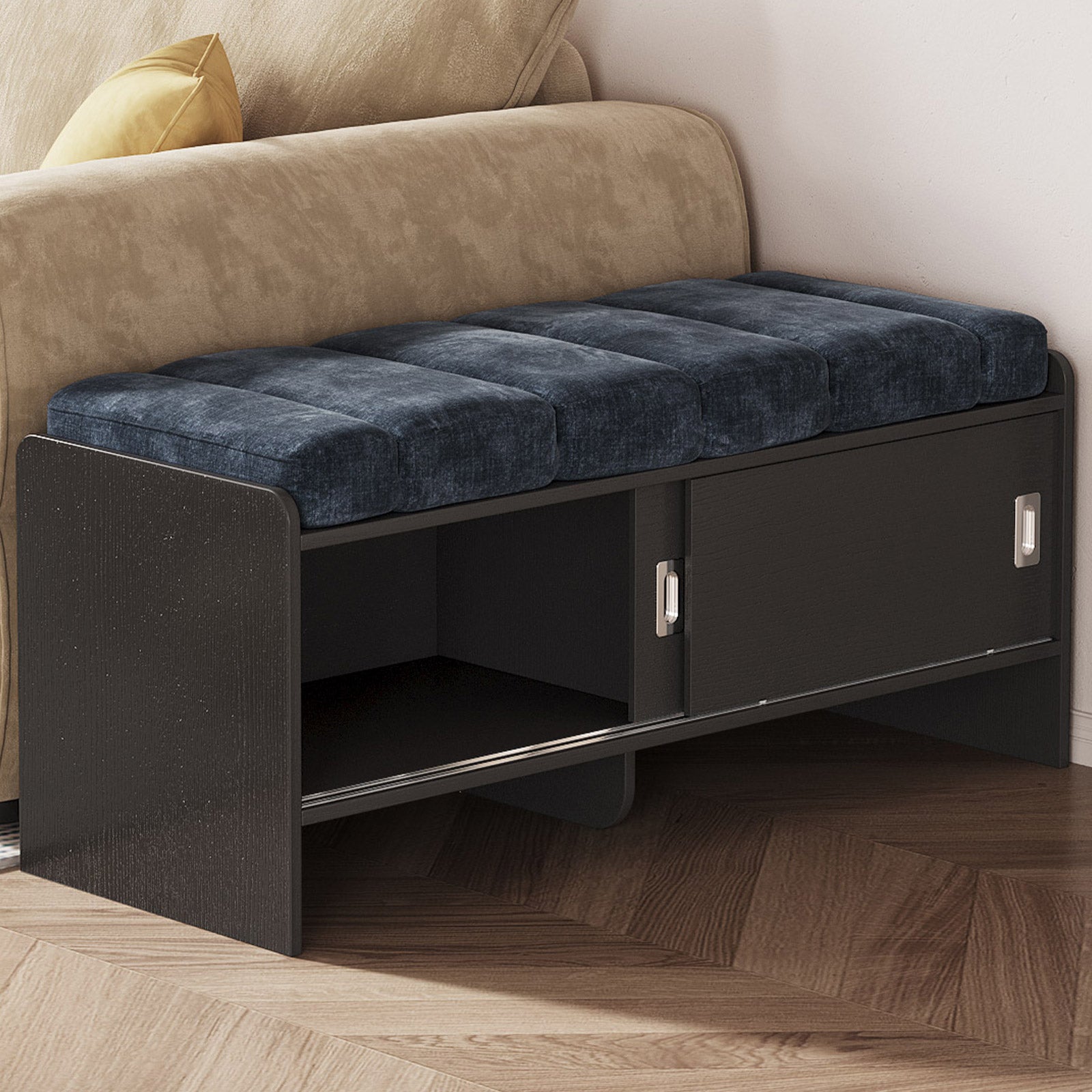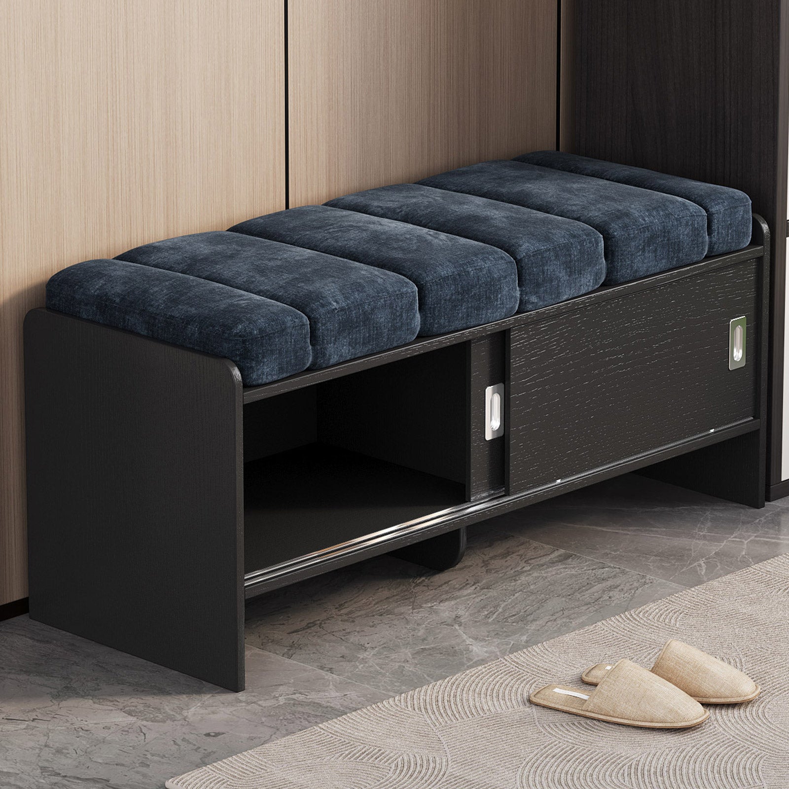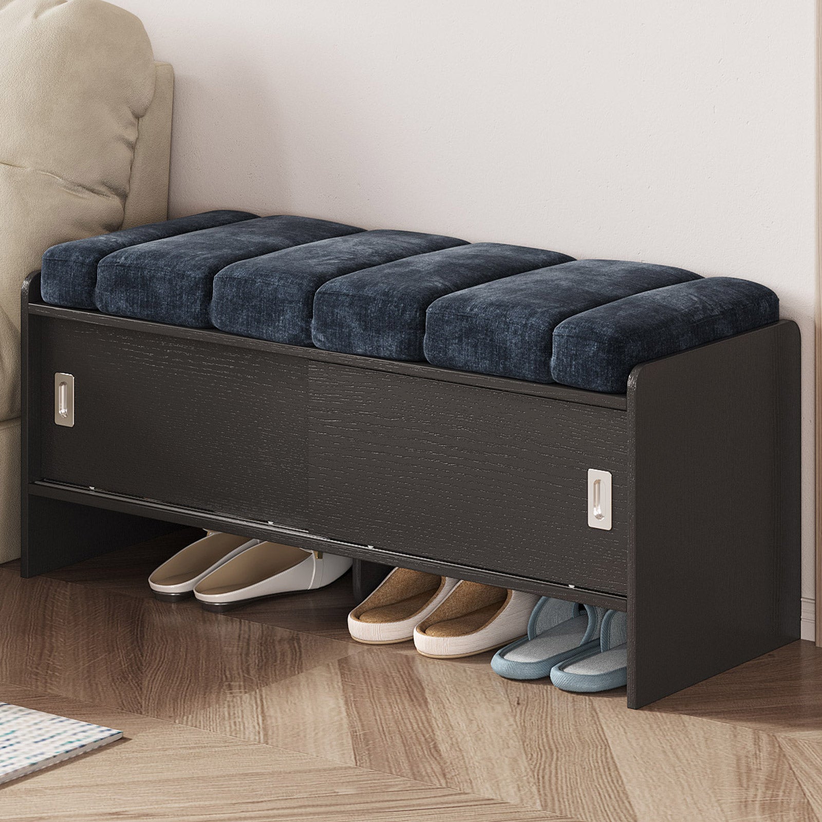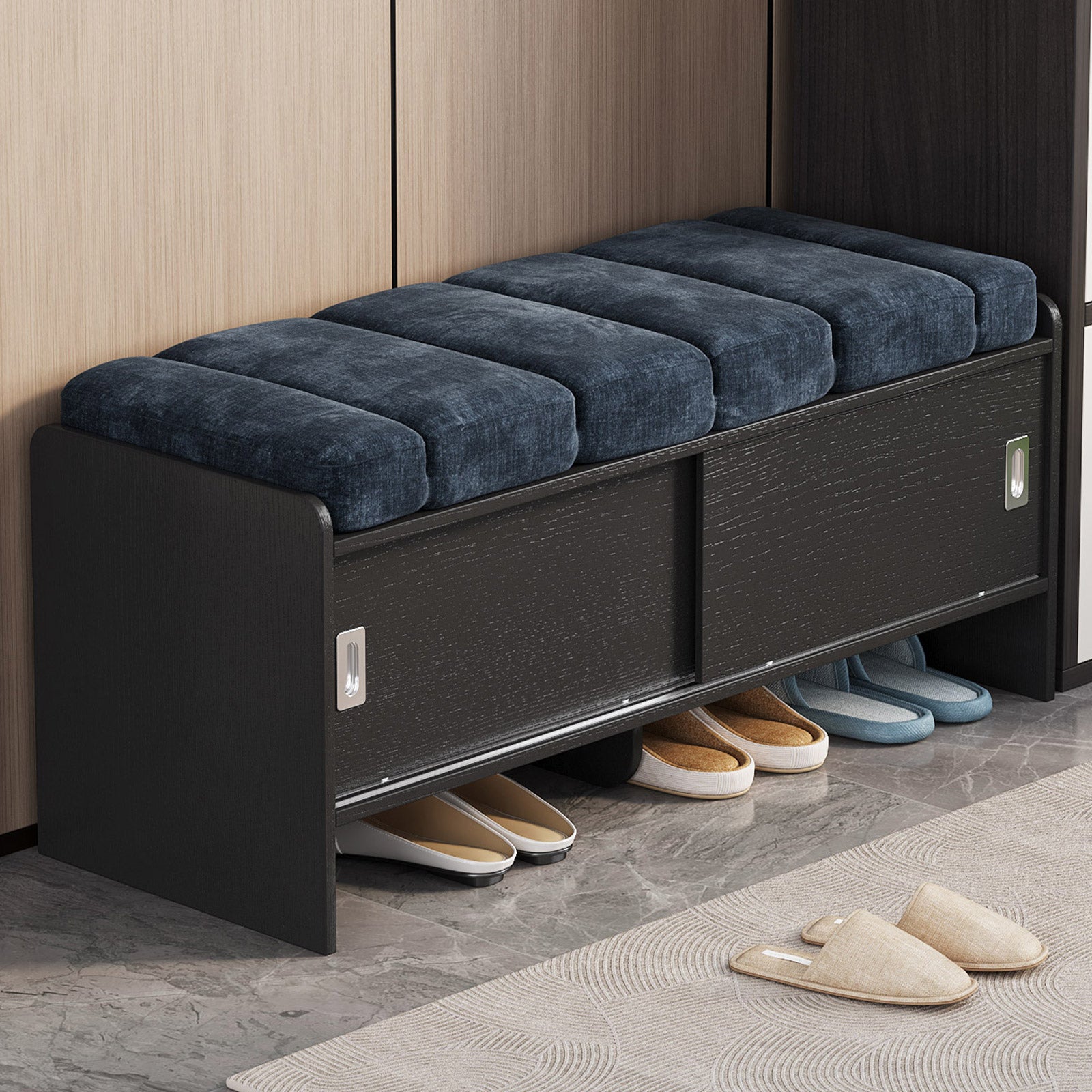 Bring comfort and organization to your home with the Guyii Modern Shoe Storage Bench. Featuring a navy blue and black finish, this 43.3" entryway organizer offers hidden and open compartments, a soft cushioned seat, and sturdy pressed-wood craftsmanship — perfect for hallways, bedrooms, or small apartments.