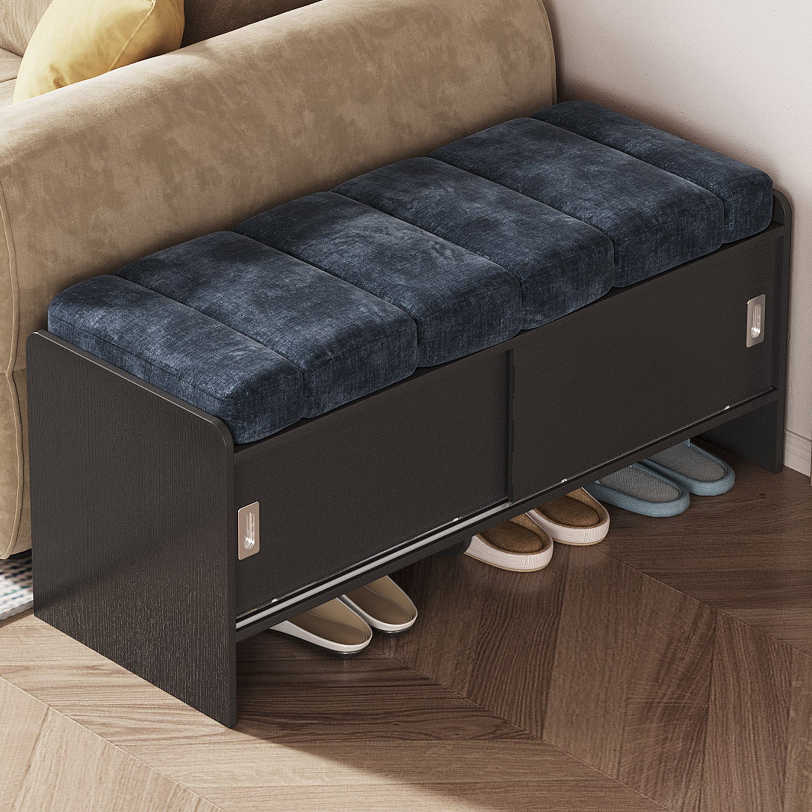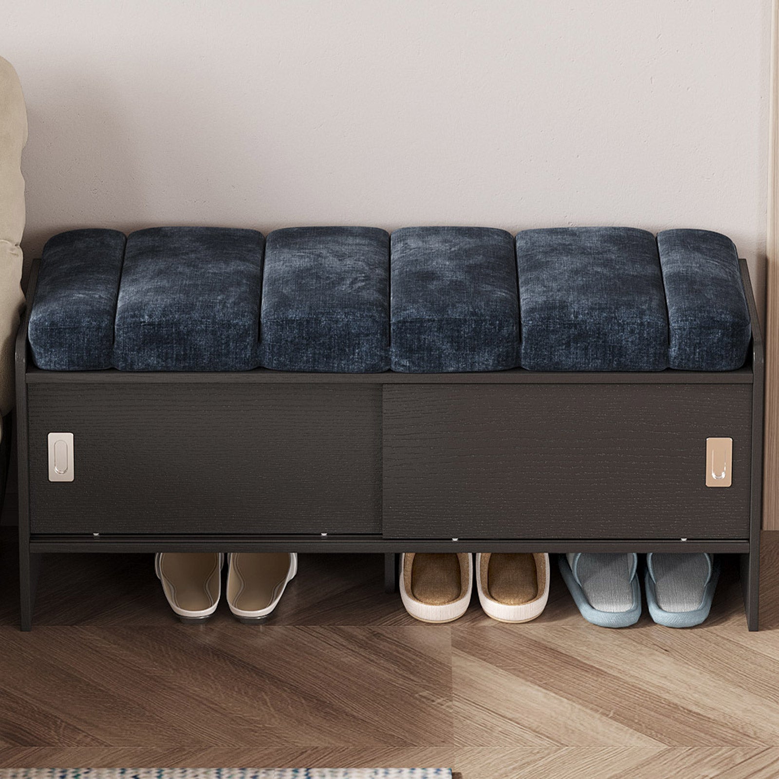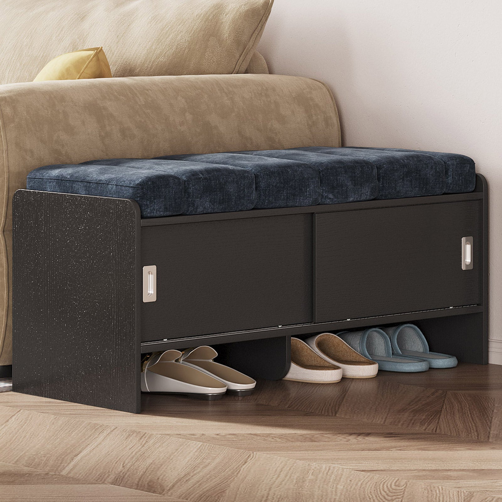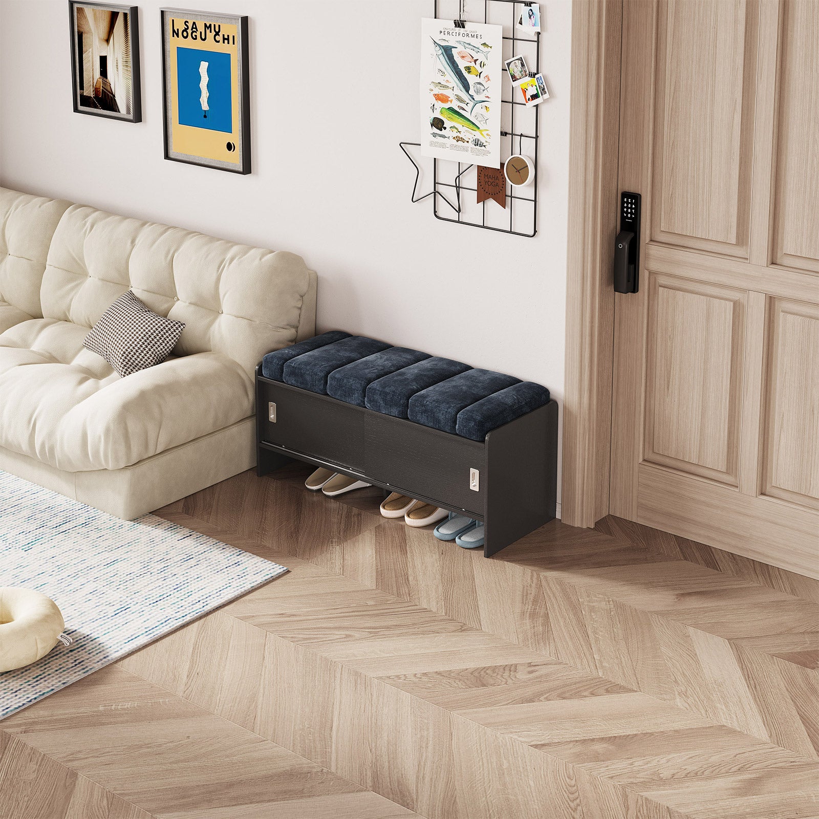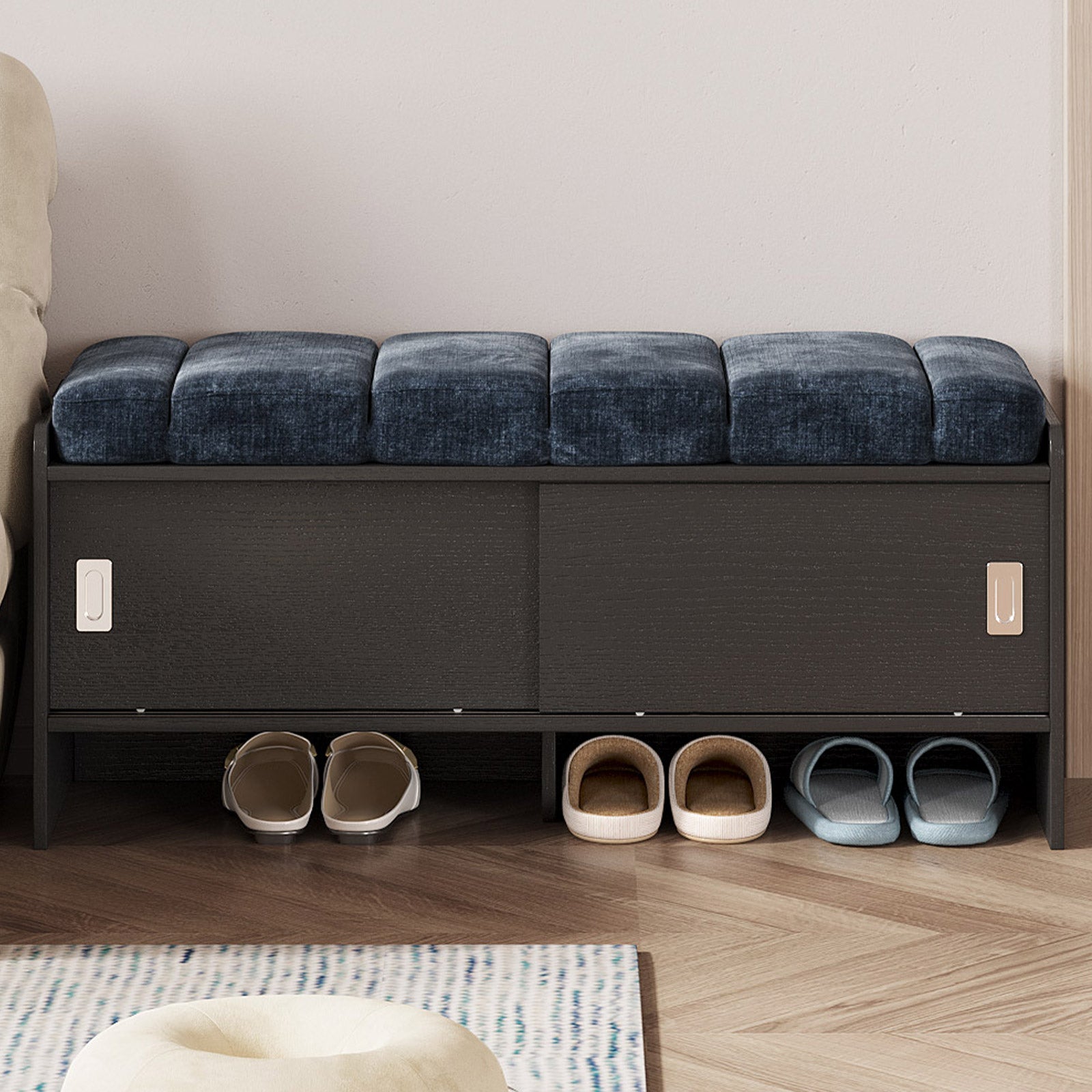 Bring comfort and organization to your home with the Guyii Modern Shoe Storage Bench. Featuring a navy blue and black finish, this 43.3" entryway organizer offers hidden and open compartments, a soft cushioned seat, and sturdy pressed-wood craftsmanship — perfect for hallways, bedrooms, or small apartments.
