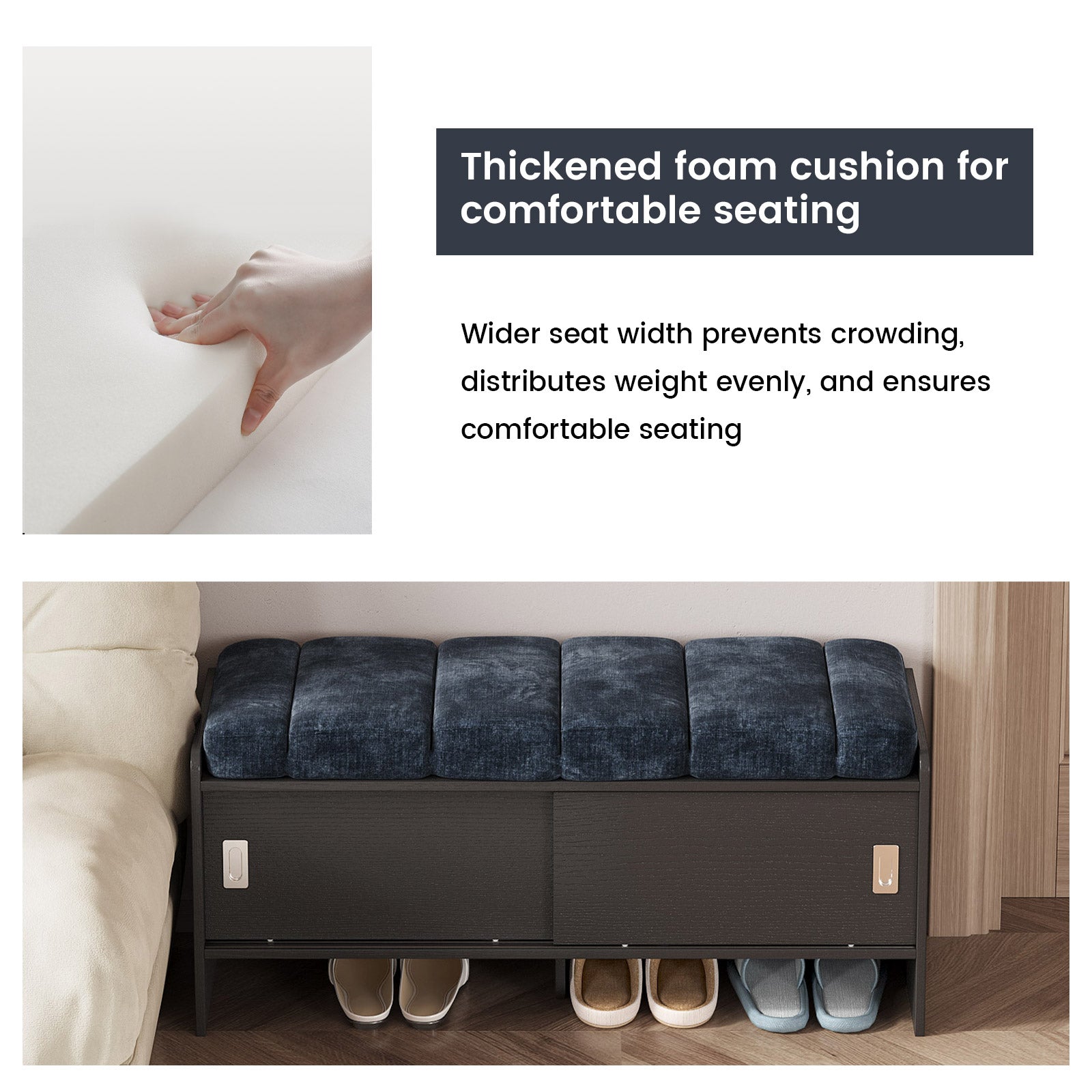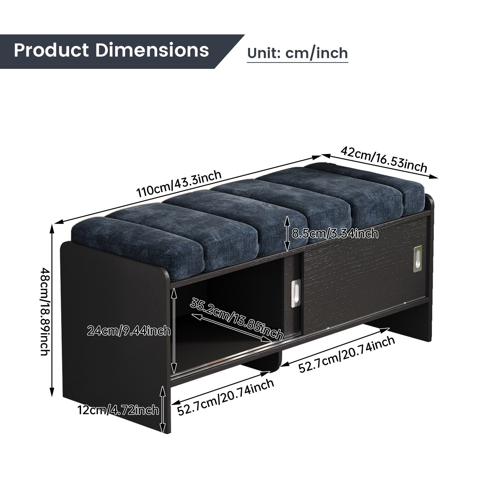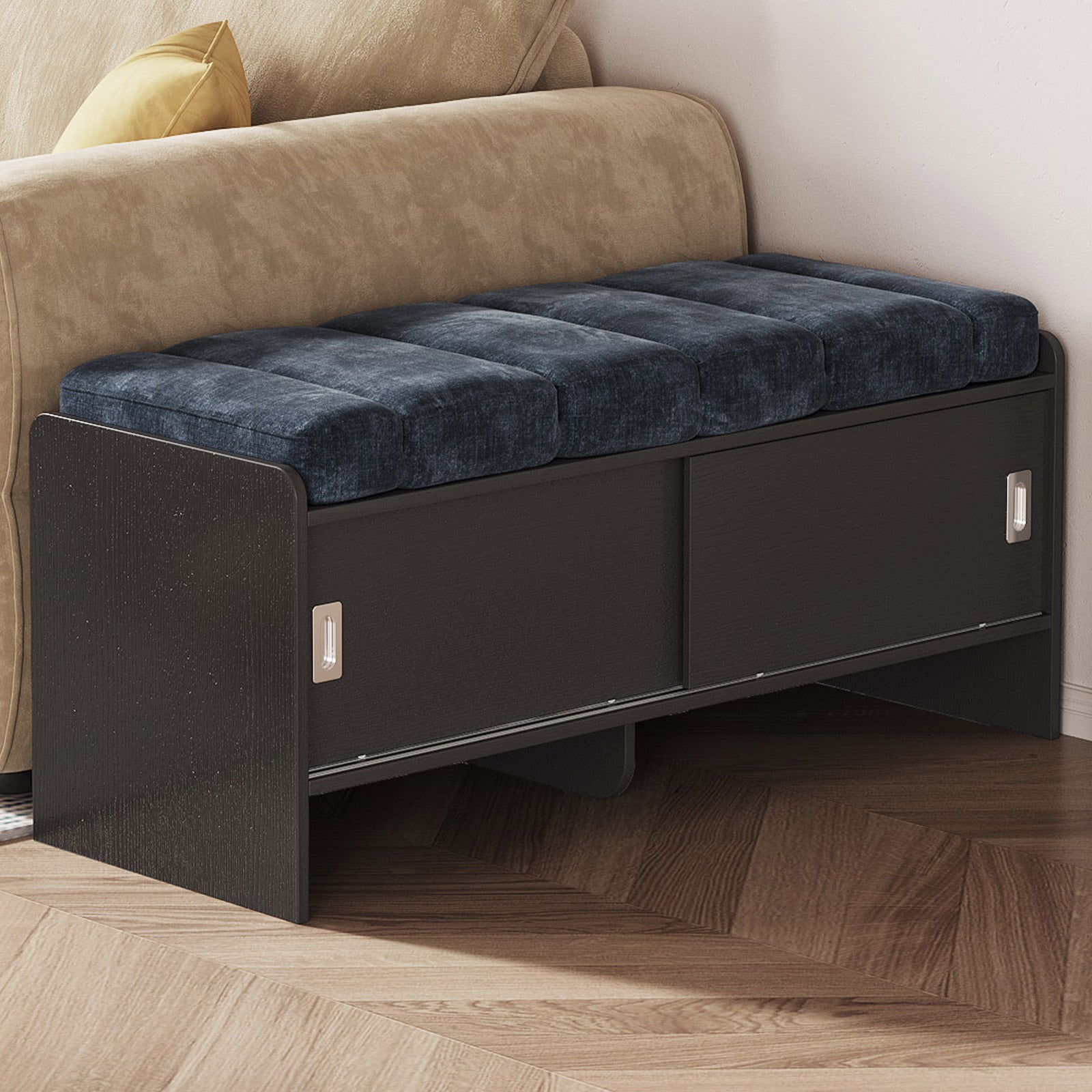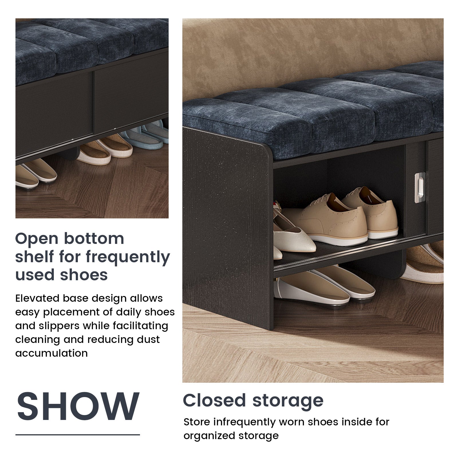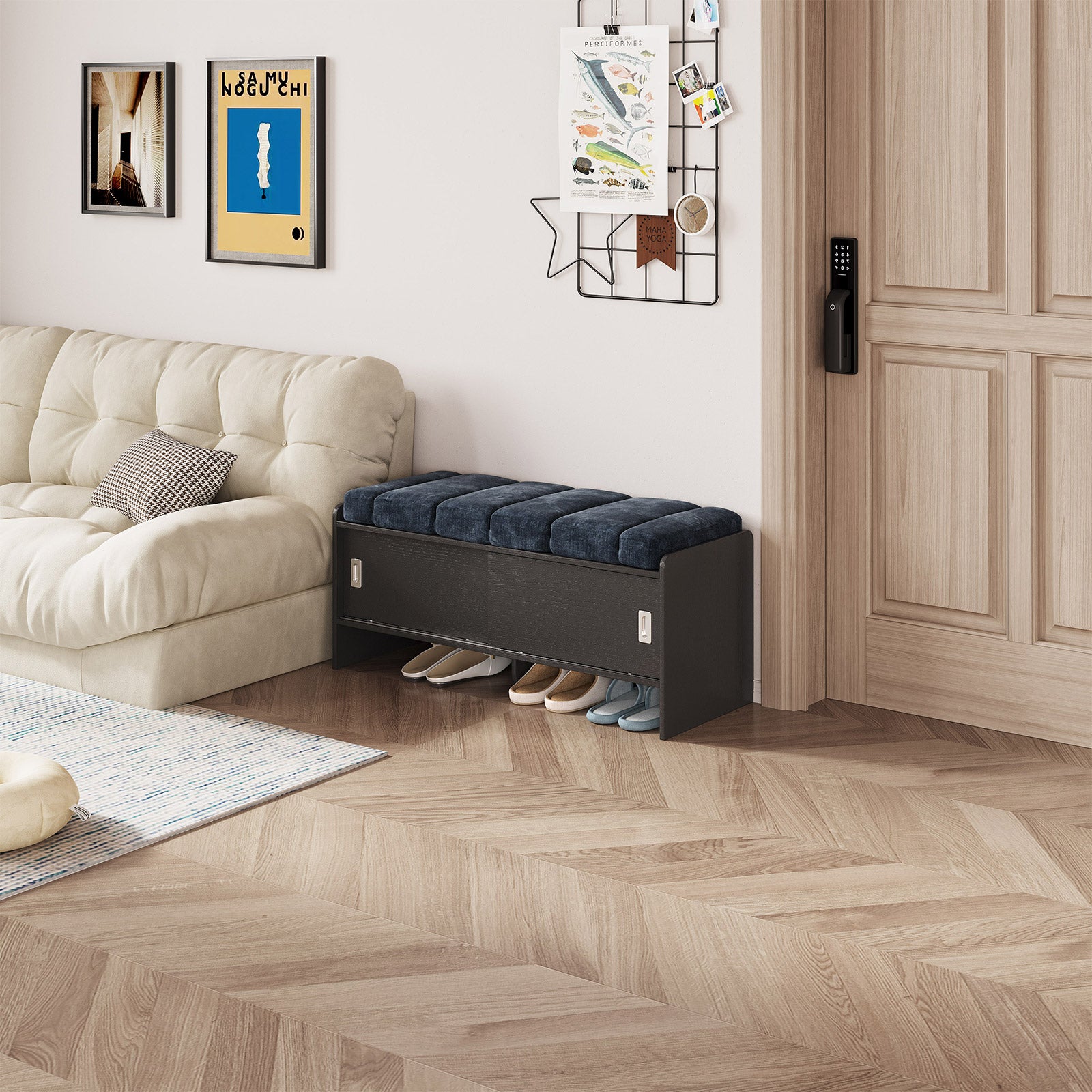 Bring comfort and organization to your home with the Guyii Modern Shoe Storage Bench. Featuring a navy blue and black finish, this 43.3" entryway organizer offers hidden and open compartments, a soft cushioned seat, and sturdy pressed-wood craftsmanship — perfect for hallways, bedrooms, or small apartments.