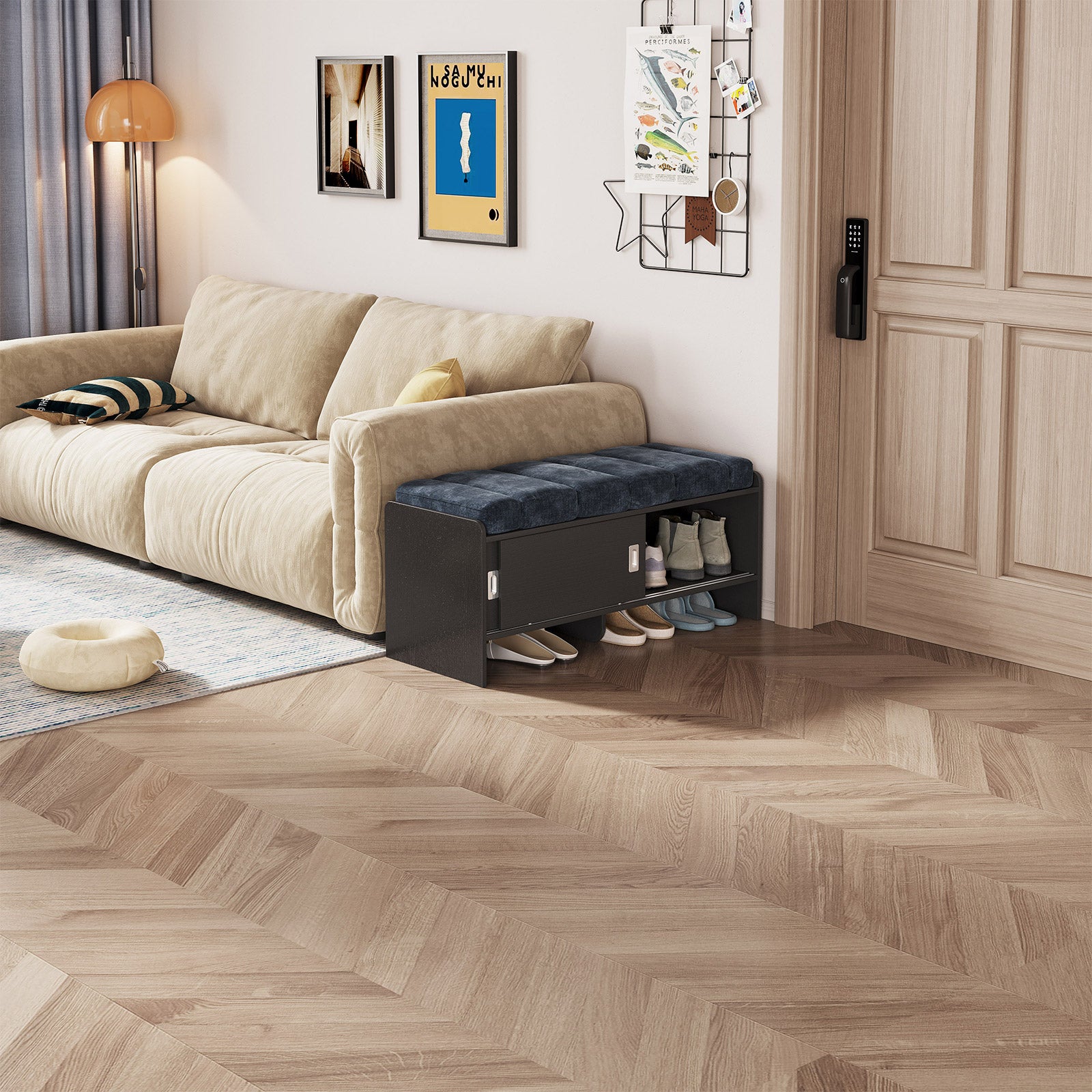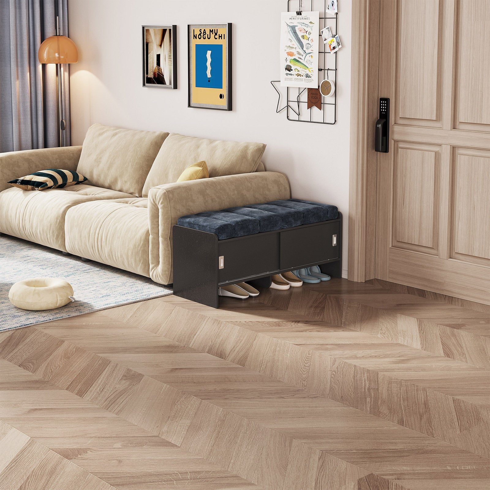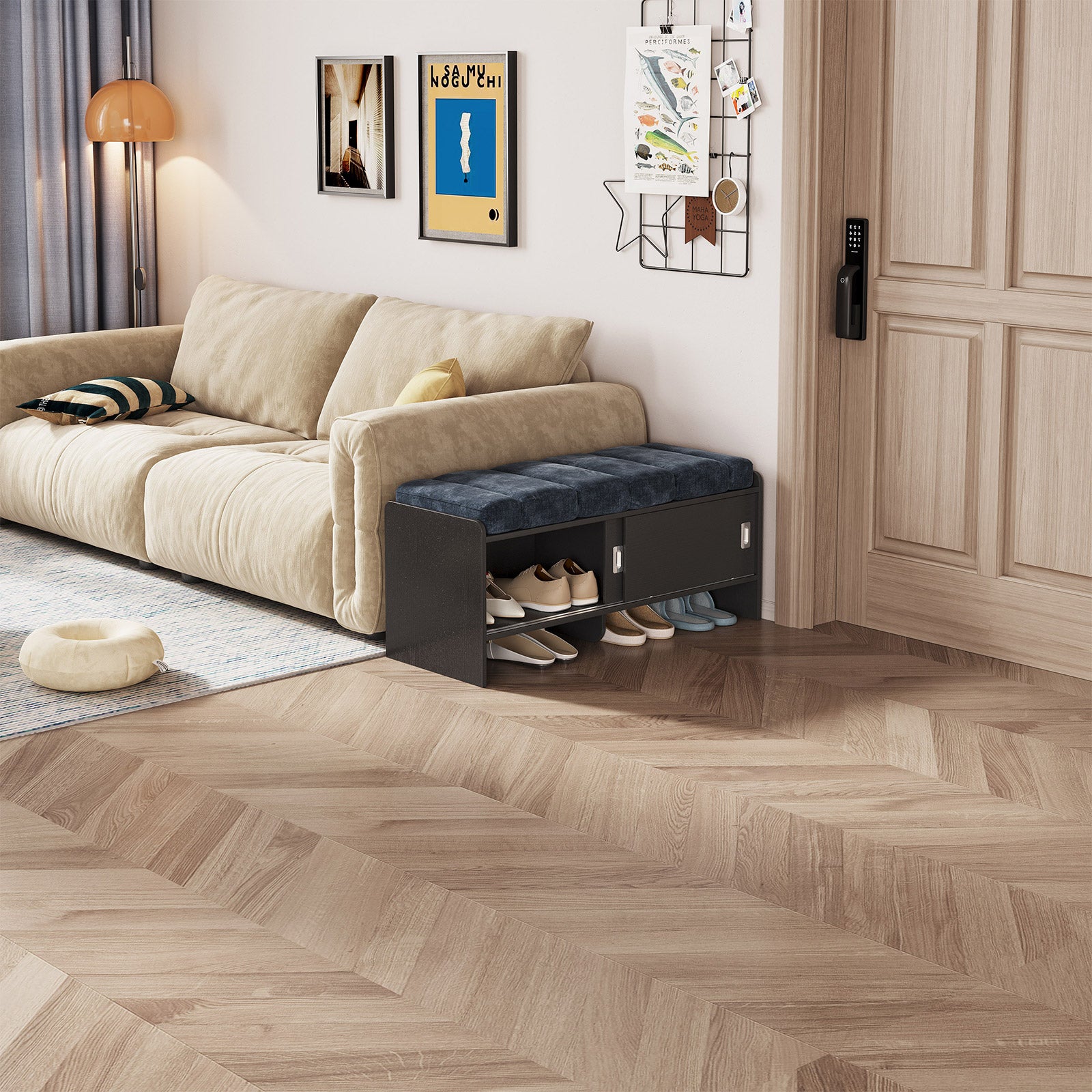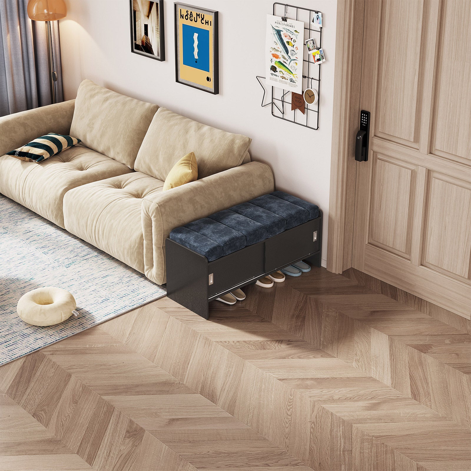 Bring comfort and organization to your home with the Guyii Modern Shoe Storage Bench. Featuring a navy blue and black finish, this 43.3" entryway organizer offers hidden and open compartments, a soft cushioned seat, and sturdy pressed-wood craftsmanship — perfect for hallways, bedrooms, or small apartments.