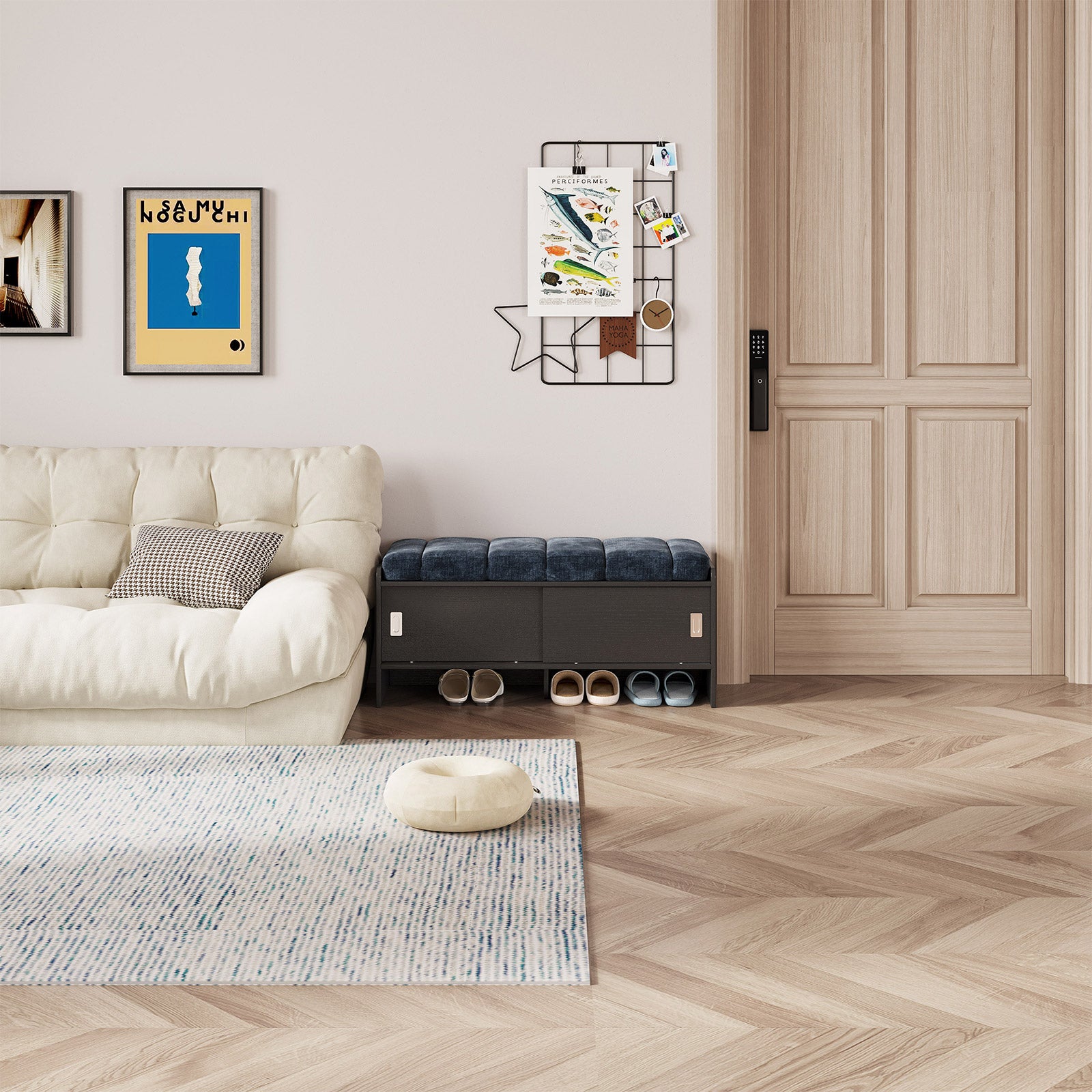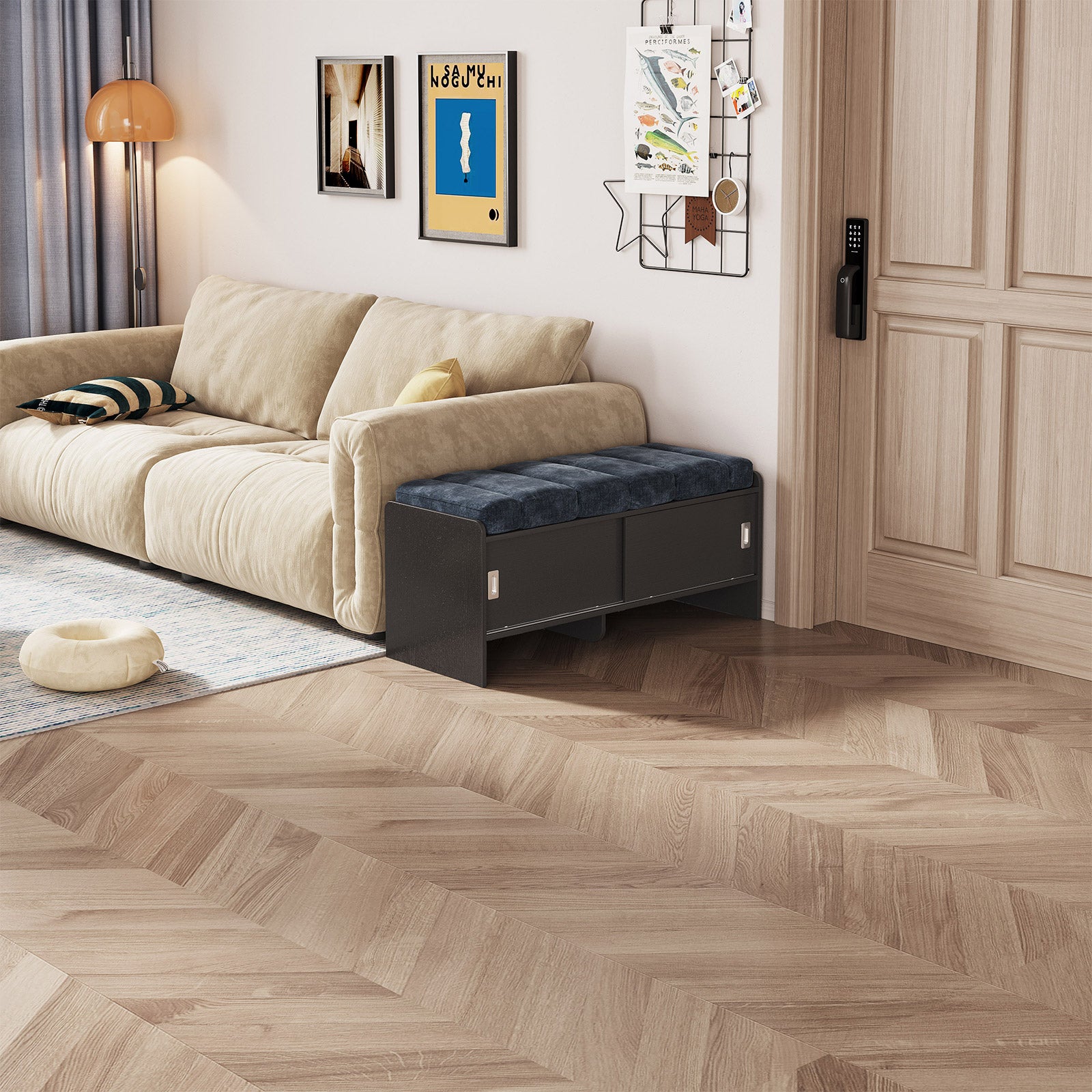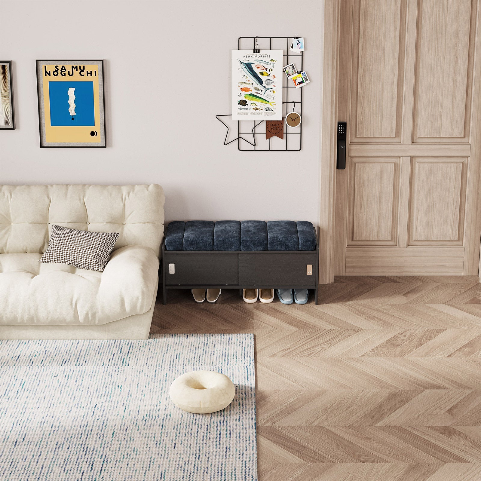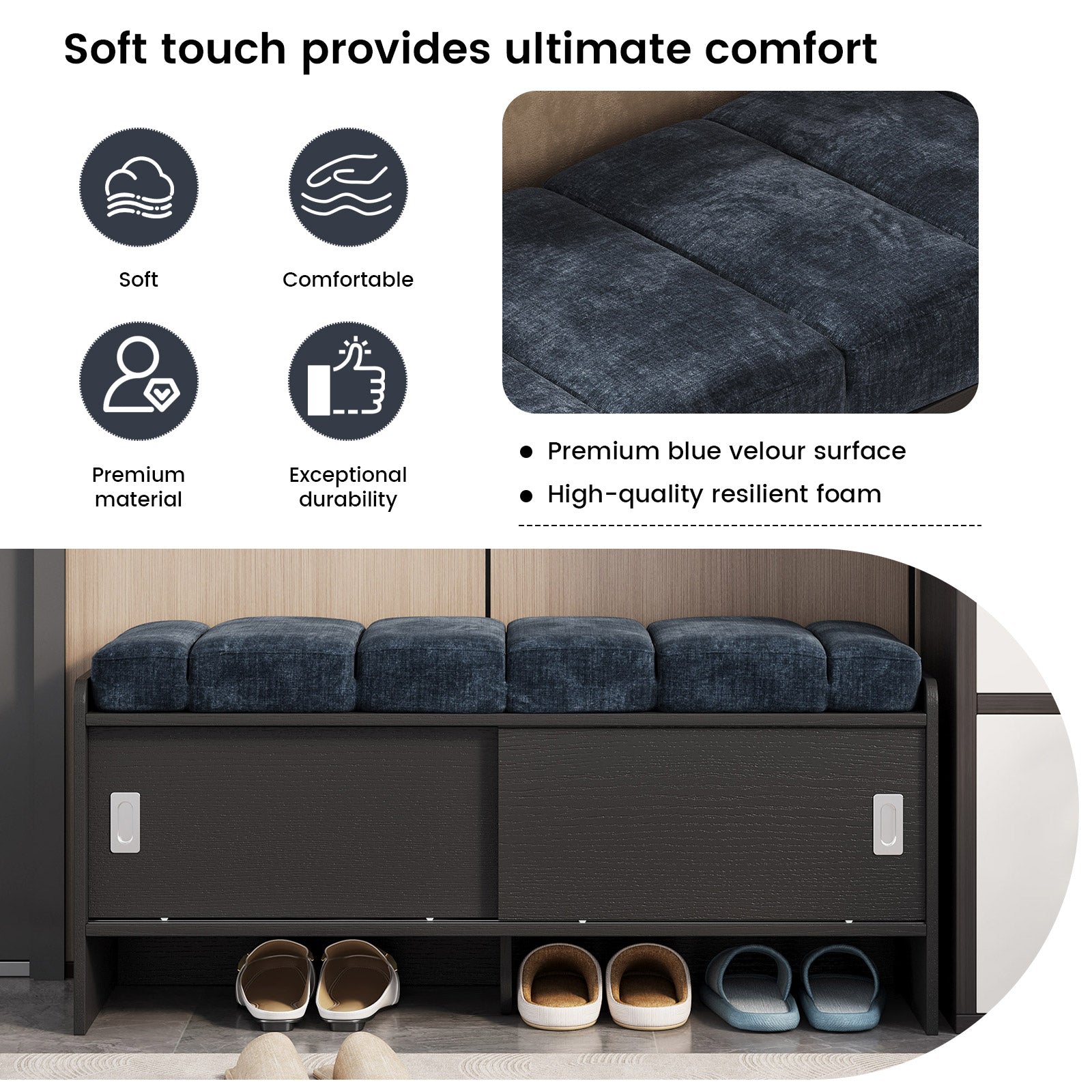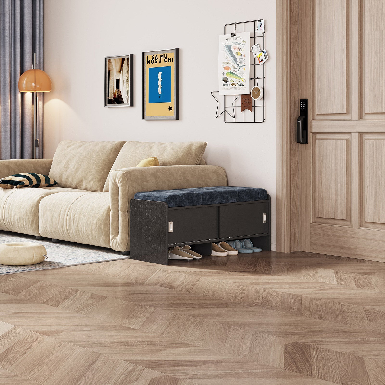 Bring comfort and organization to your home with the Guyii Modern Shoe Storage Bench. Featuring a navy blue and black finish, this 43.3" entryway organizer offers hidden and open compartments, a soft cushioned seat, and sturdy pressed-wood craftsmanship — perfect for hallways, bedrooms, or small apartments.
