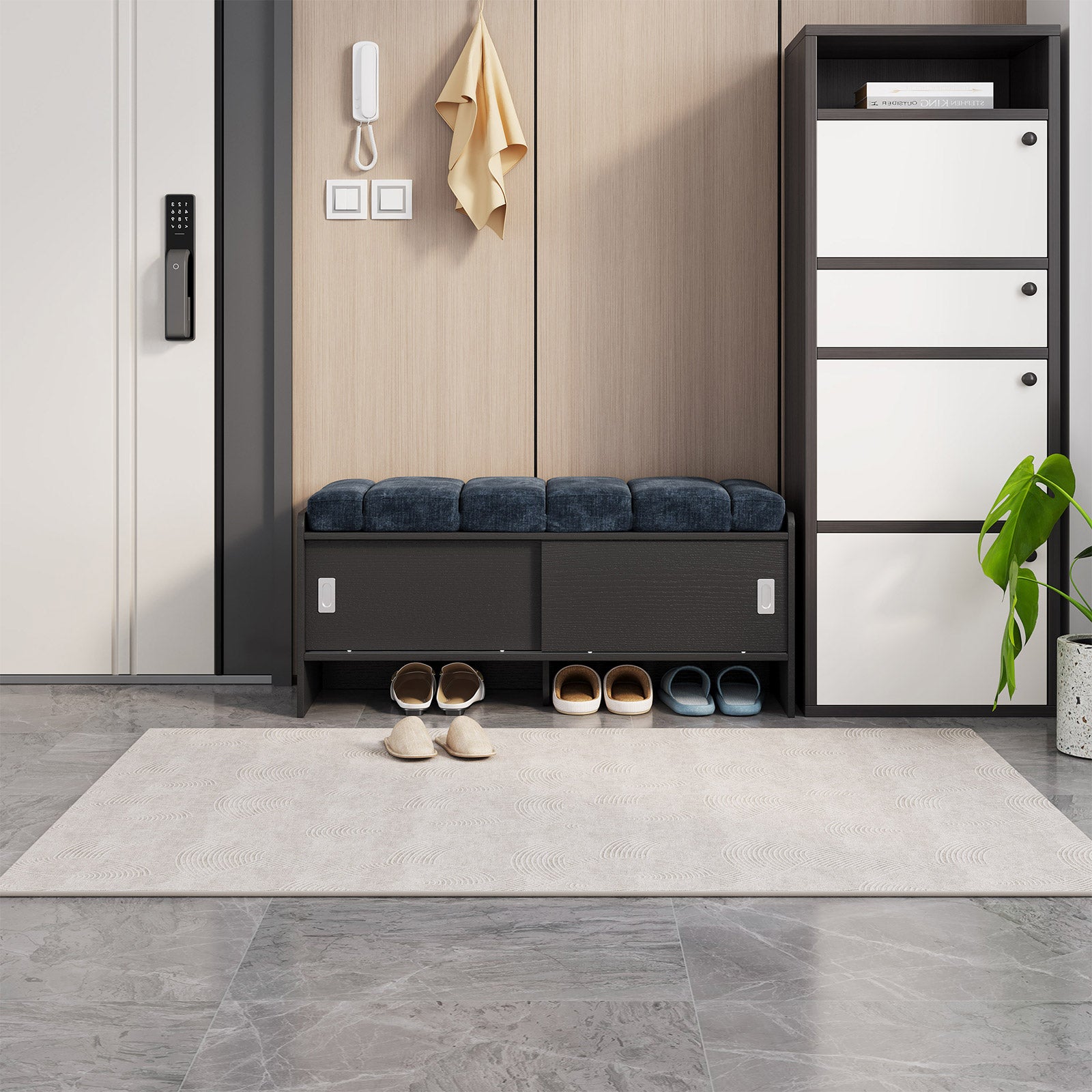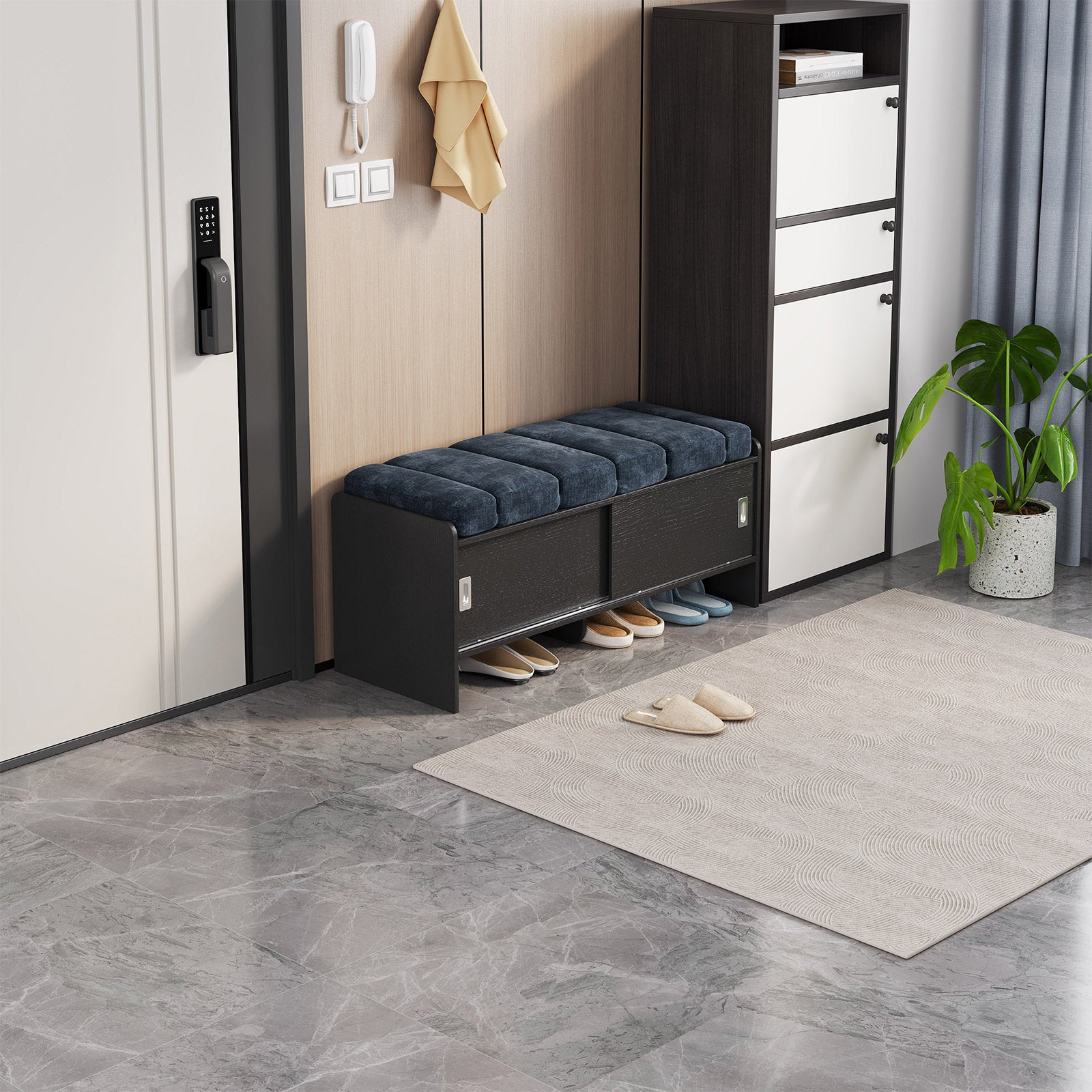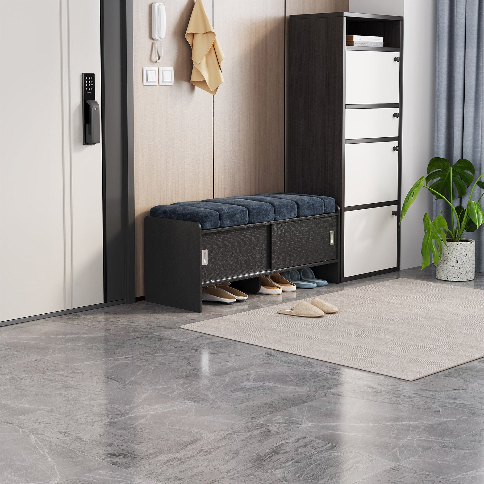 Guyii Modern Shoe Storage Bench with Cabinet & Cushion Seat – Navy Blue Entryway Organizer with Hidden Storage & Tier Shelves