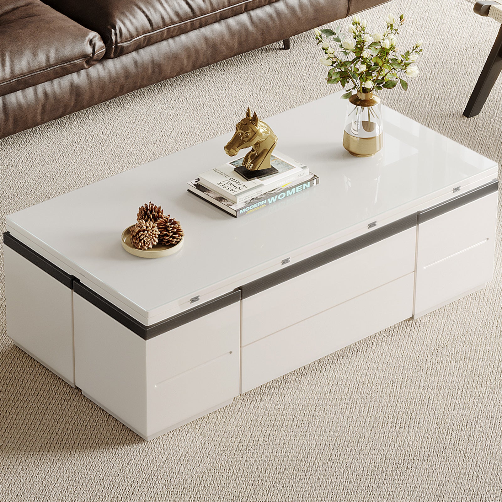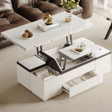 Guyii extendable lift top coffee table with 4 storage stools. Multifunctional 3-in-1 design for dining, working & storage. Perfect for UK living rooms.