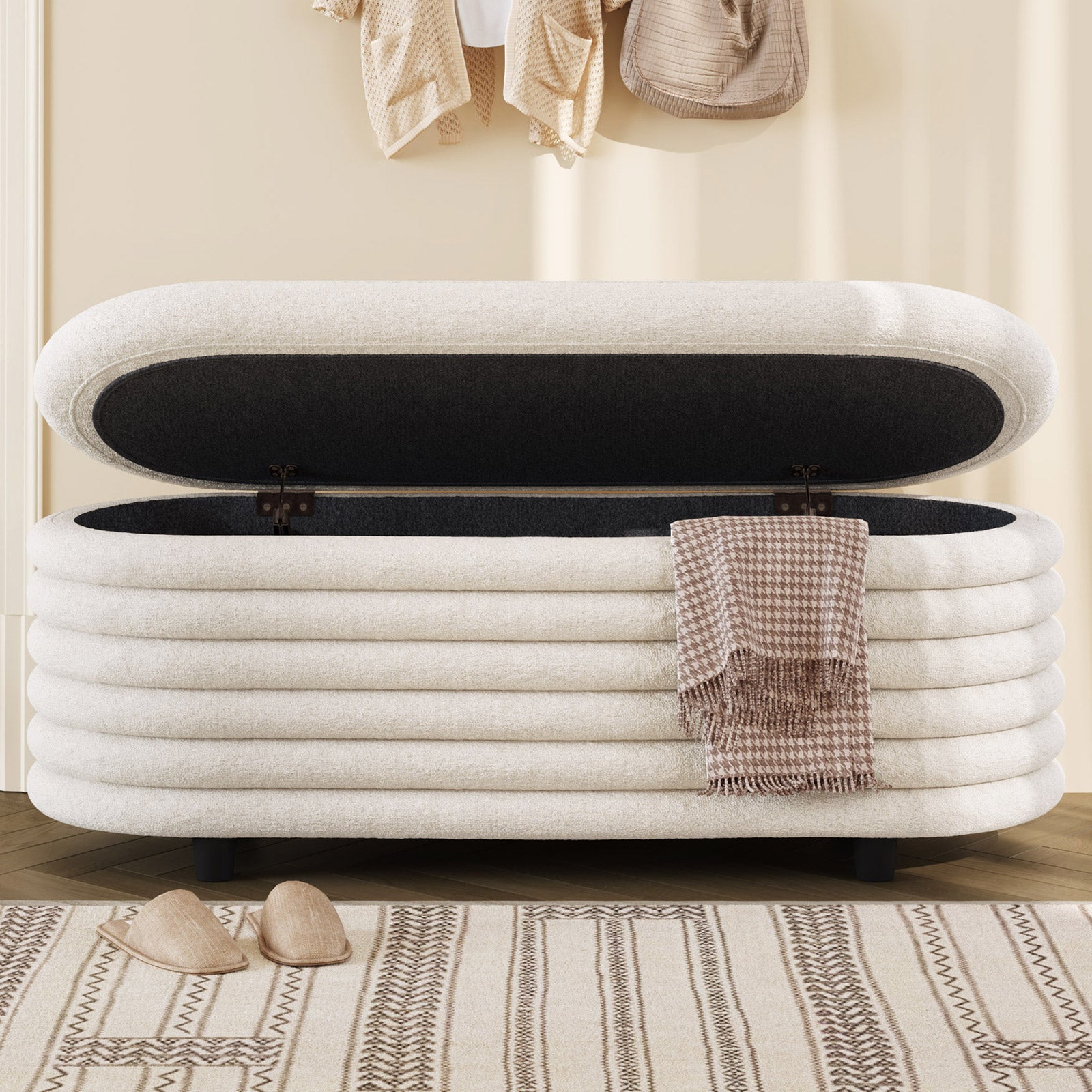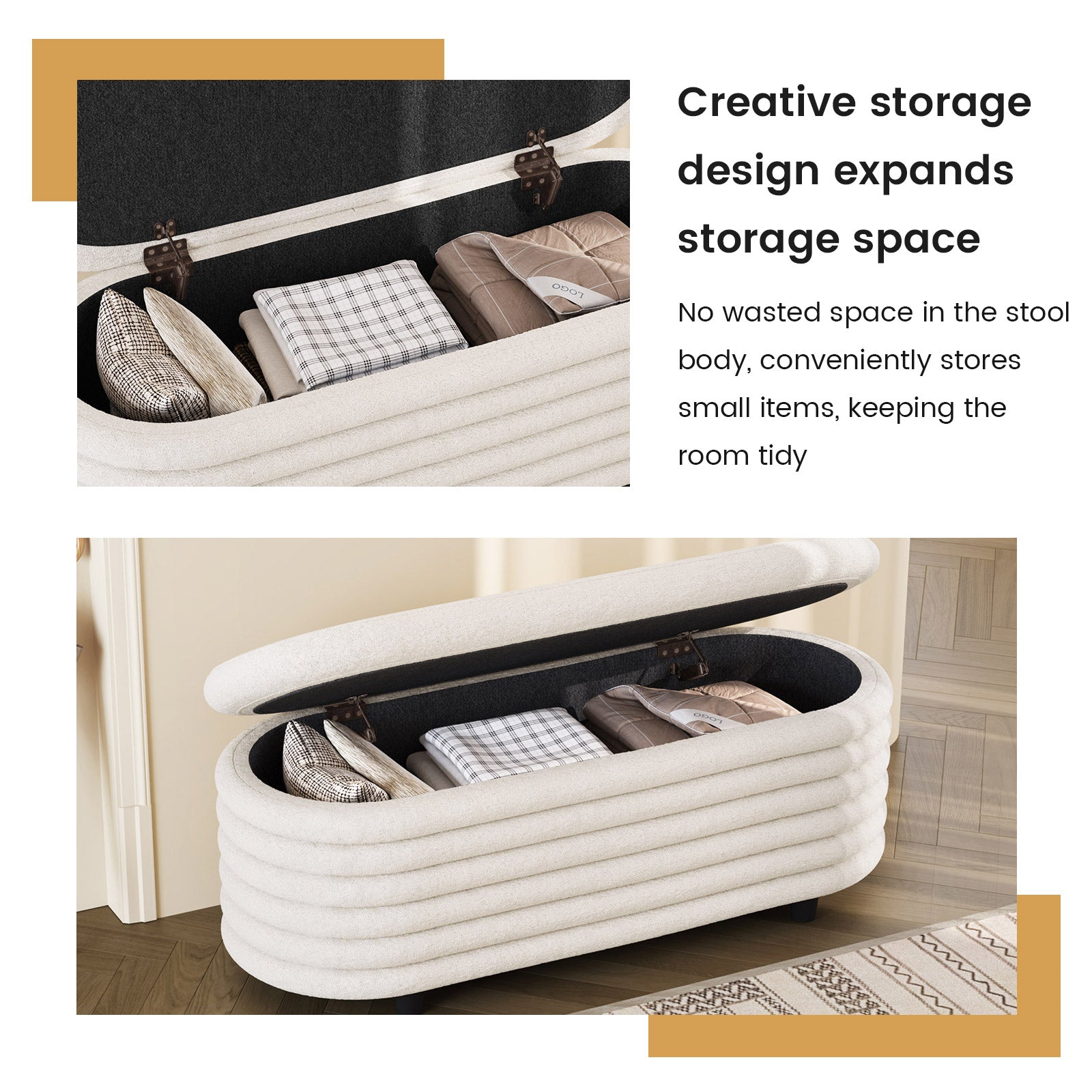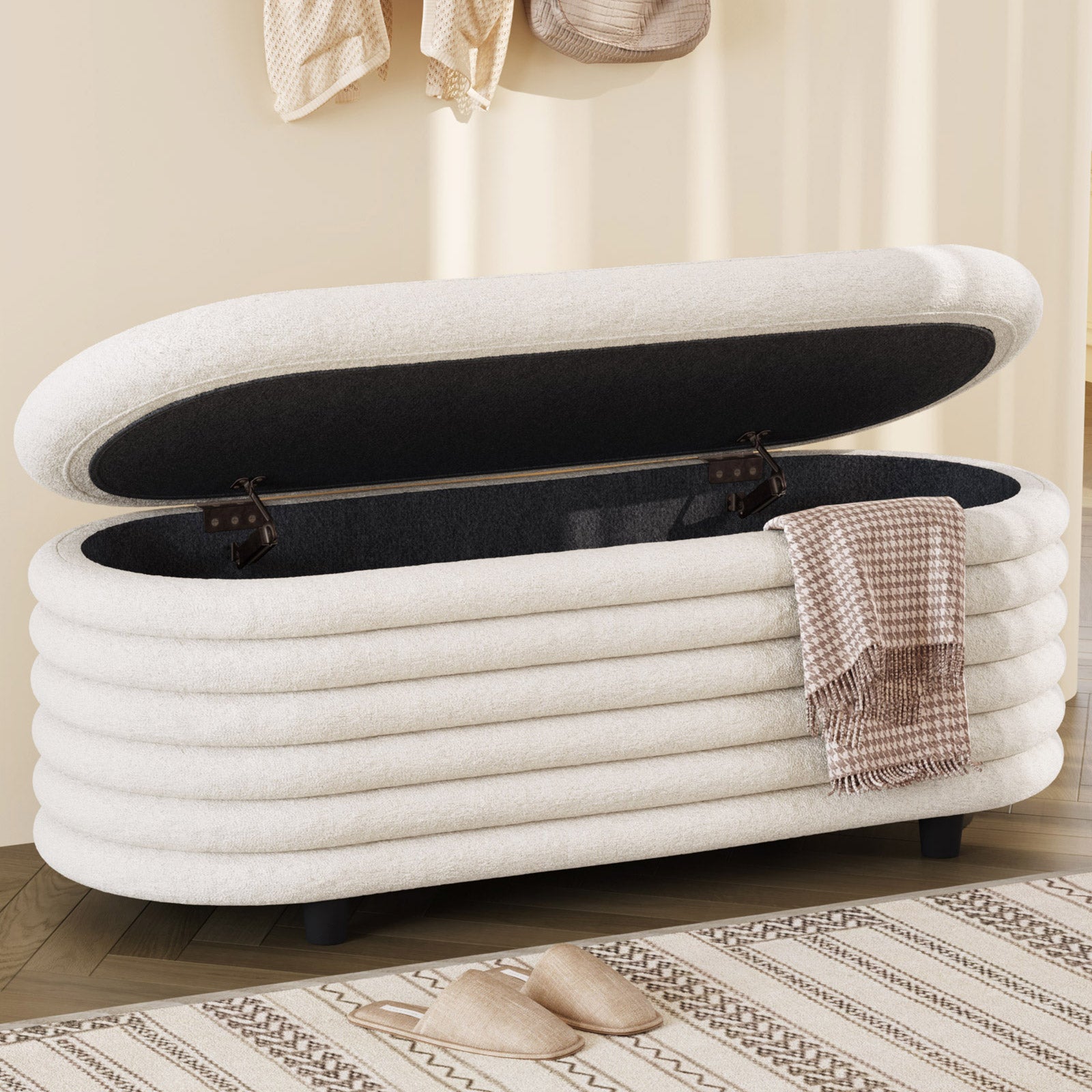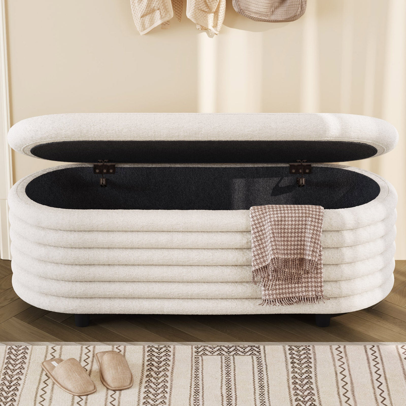 ✔ Hidden Storage Compartment — Flip open the safety-hinged lid to reveal a spacious interior, perfect for blankets, pillows, toys, or daily essentials. Keep your home organized without sacrificing style.