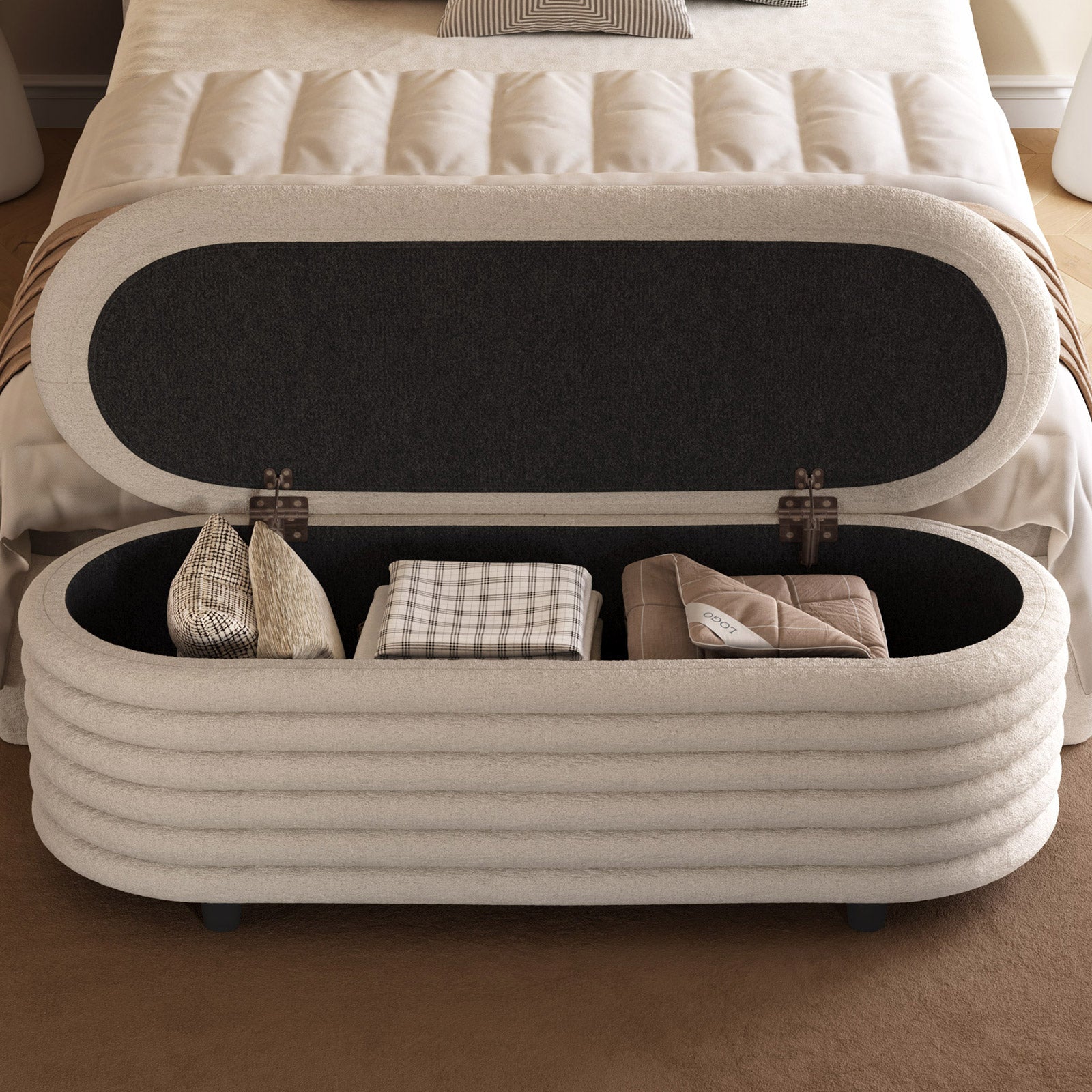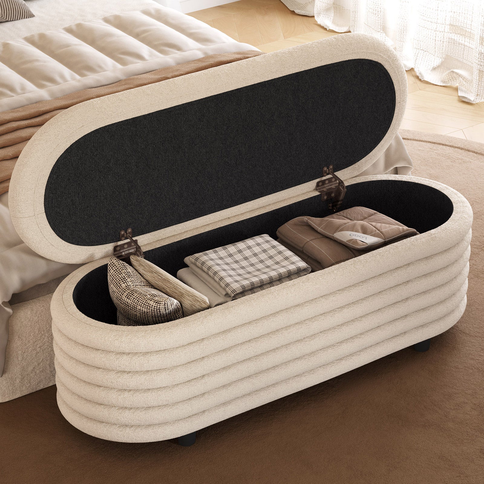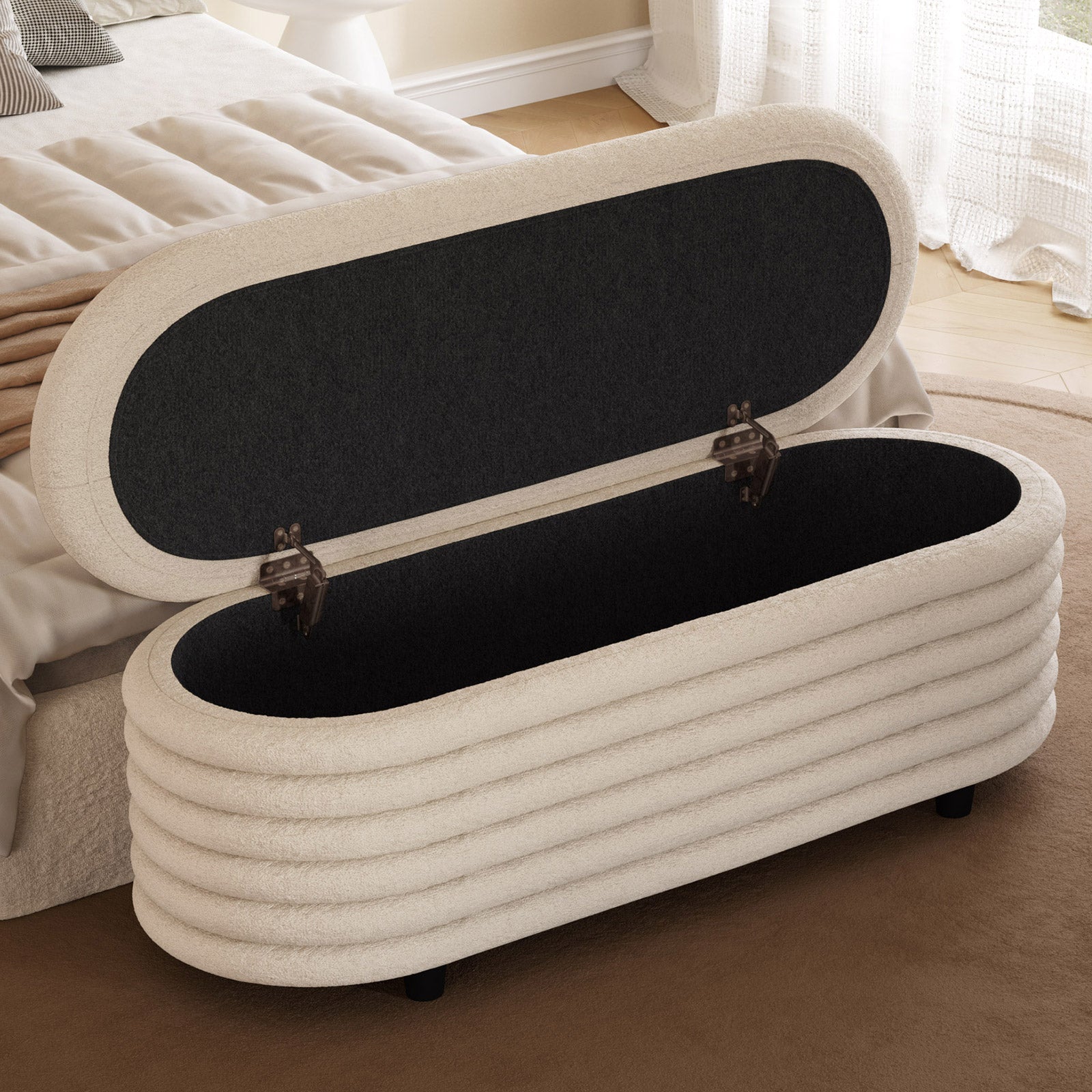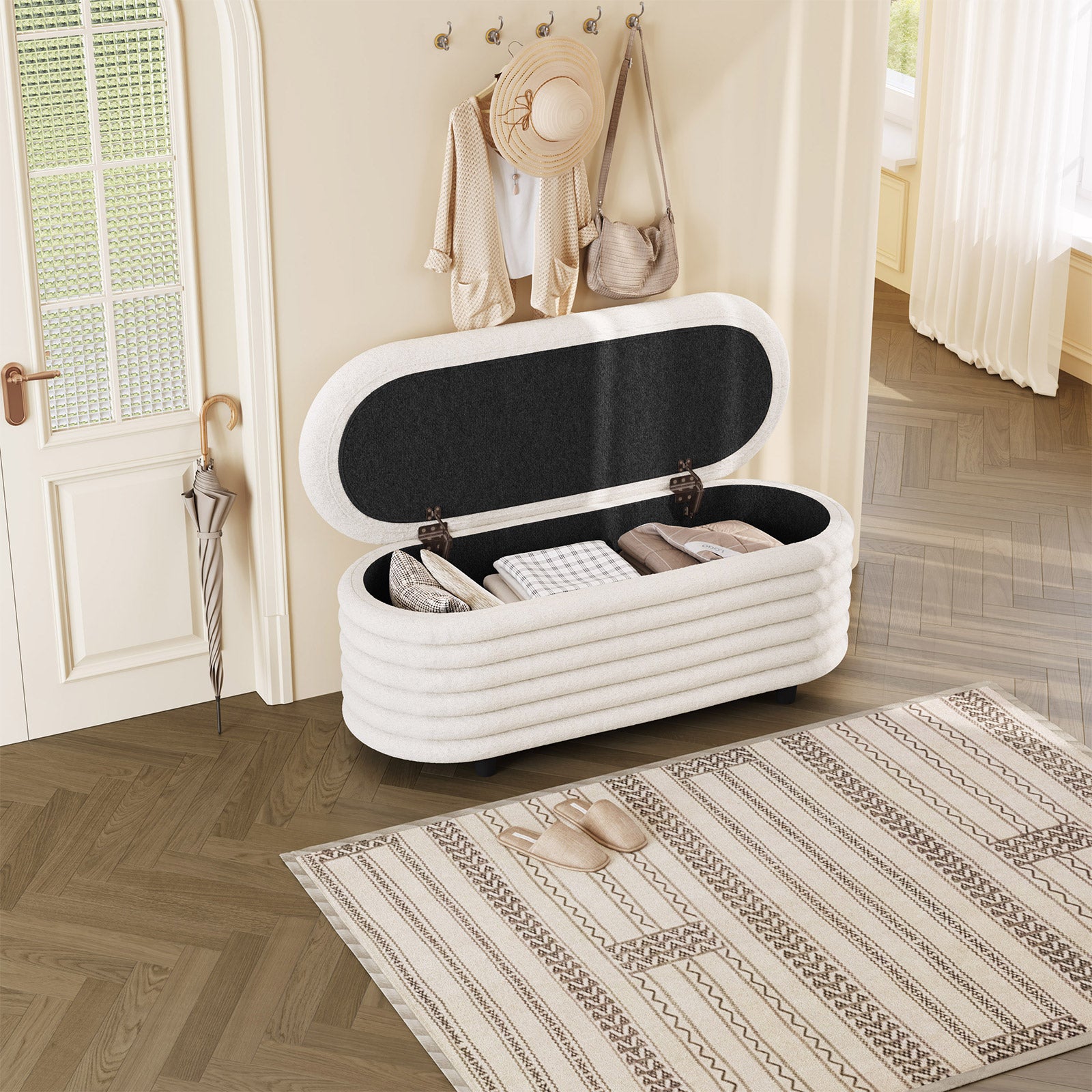 ✔ Hidden Storage Compartment — Flip open the safety-hinged lid to reveal a spacious interior, perfect for blankets, pillows, toys, or daily essentials. Keep your home organized without sacrificing style.