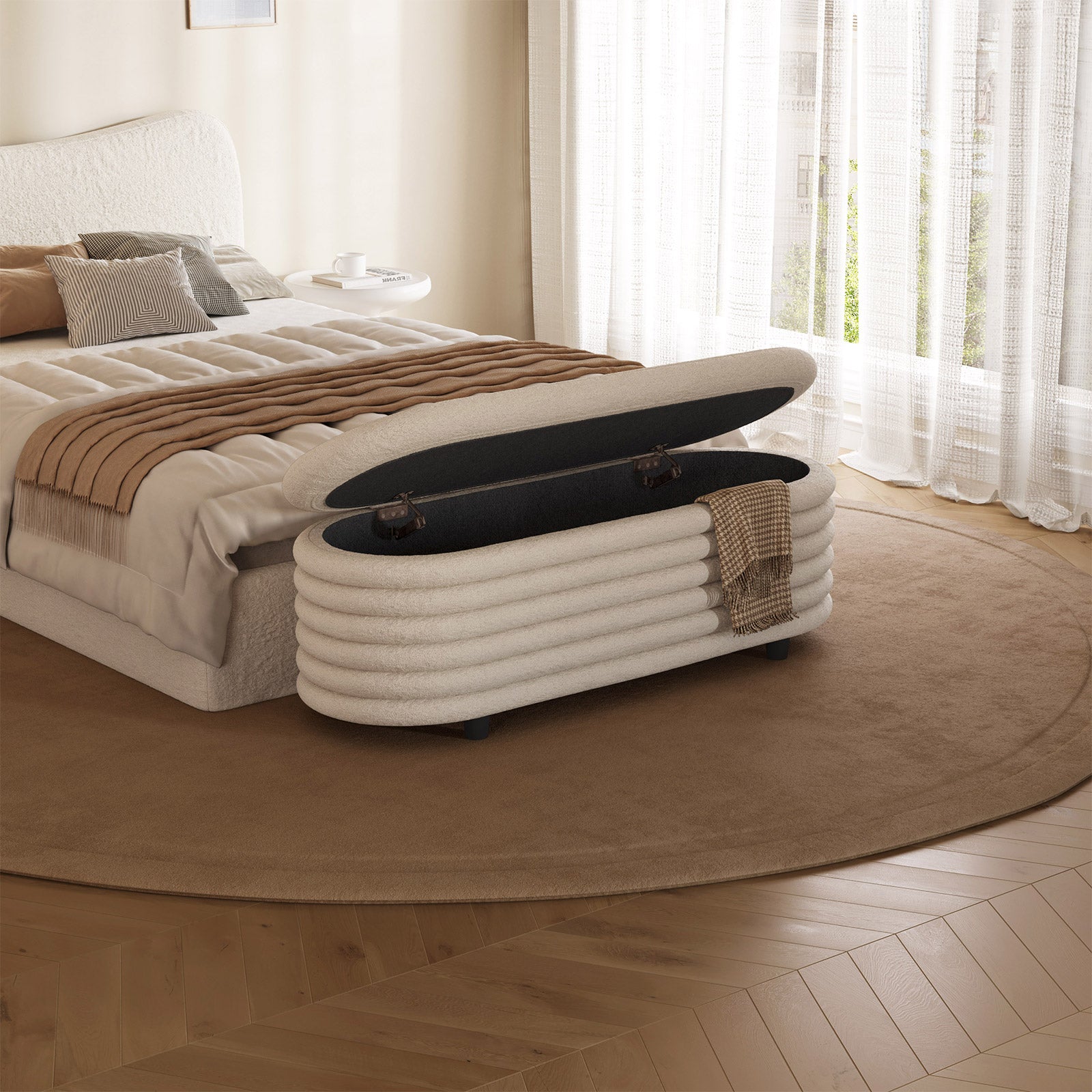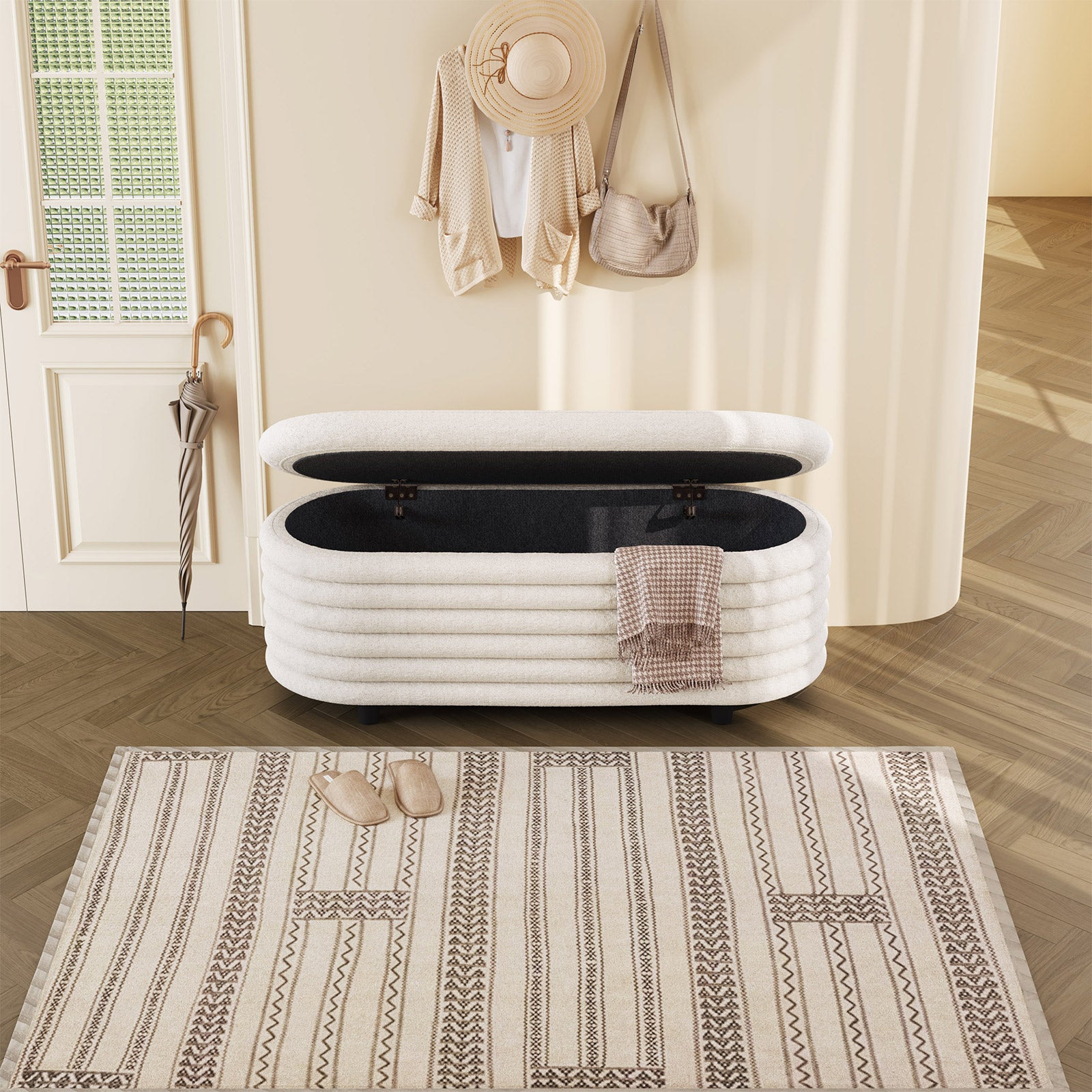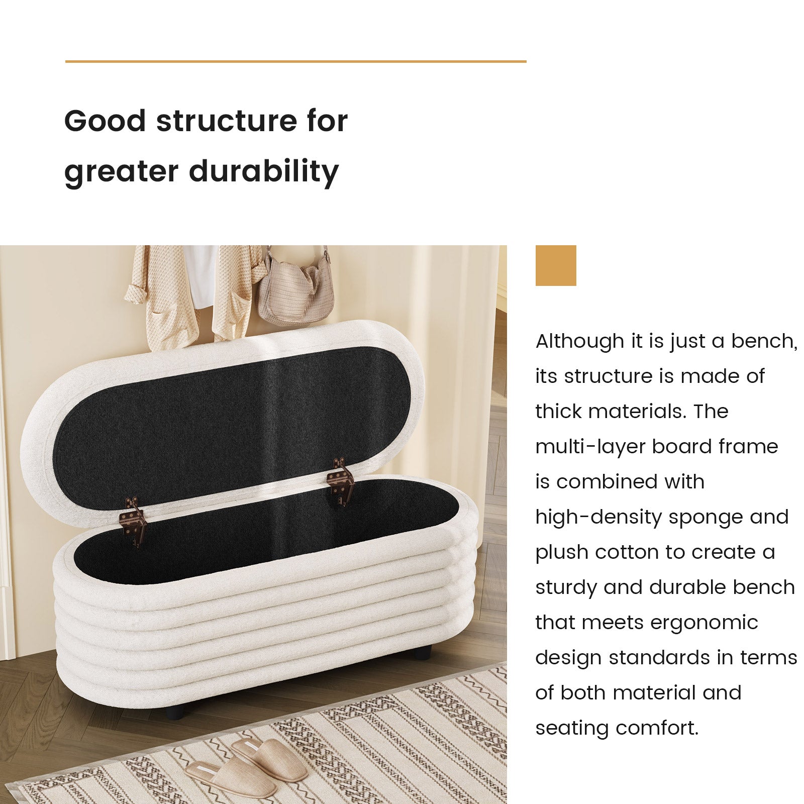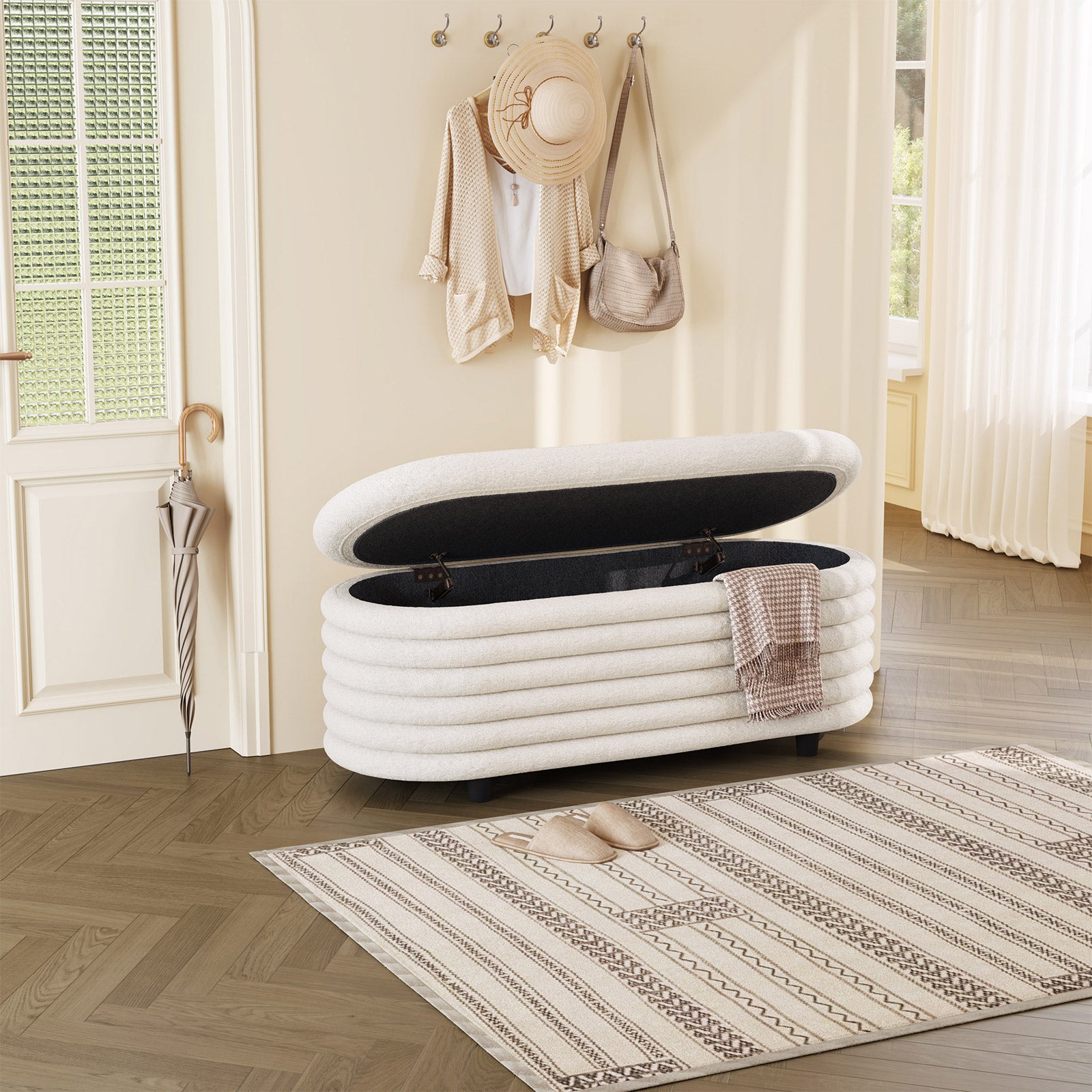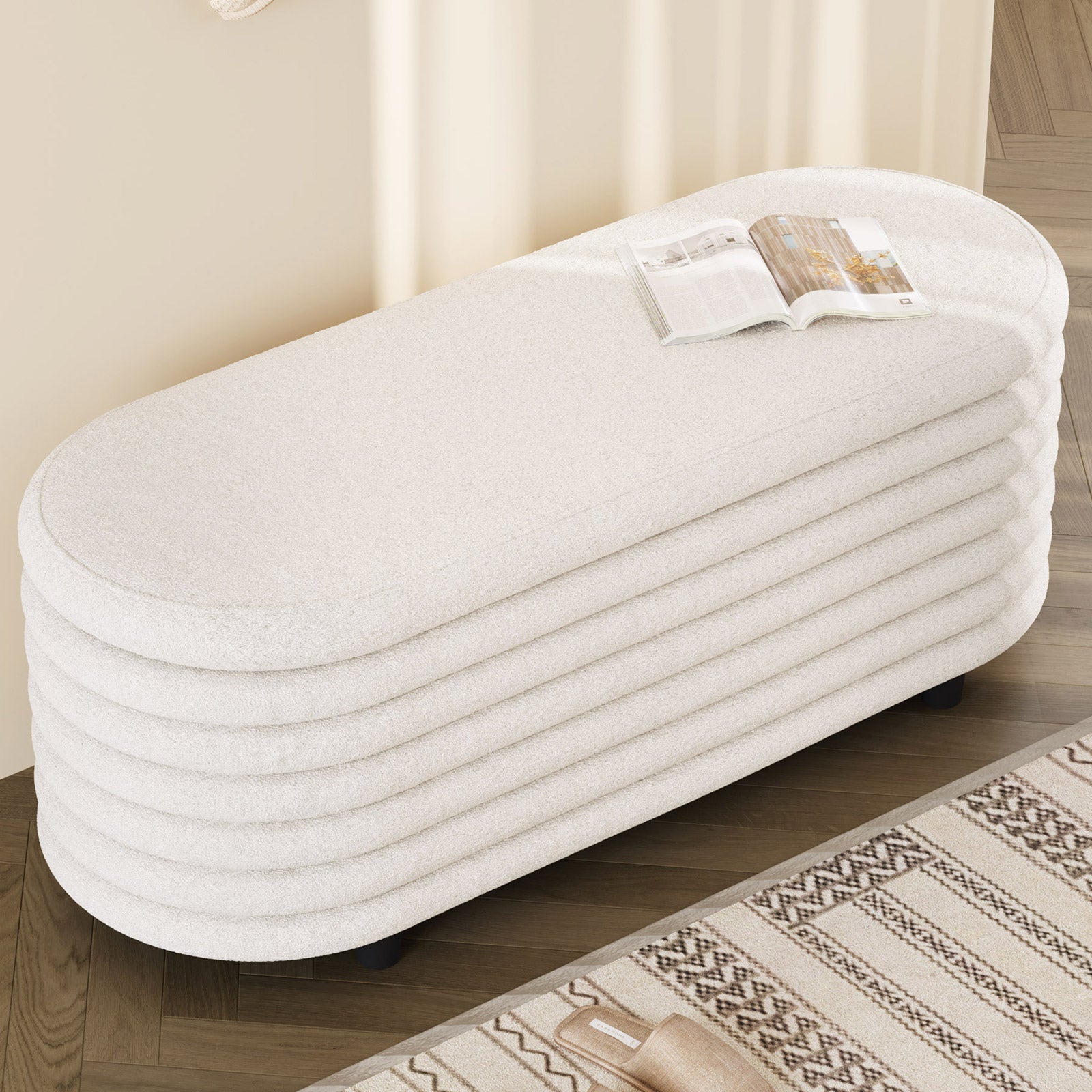 ✔ Hidden Storage Compartment — Flip open the safety-hinged lid to reveal a spacious interior, perfect for blankets, pillows, toys, or daily essentials. Keep your home organized without sacrificing style.
