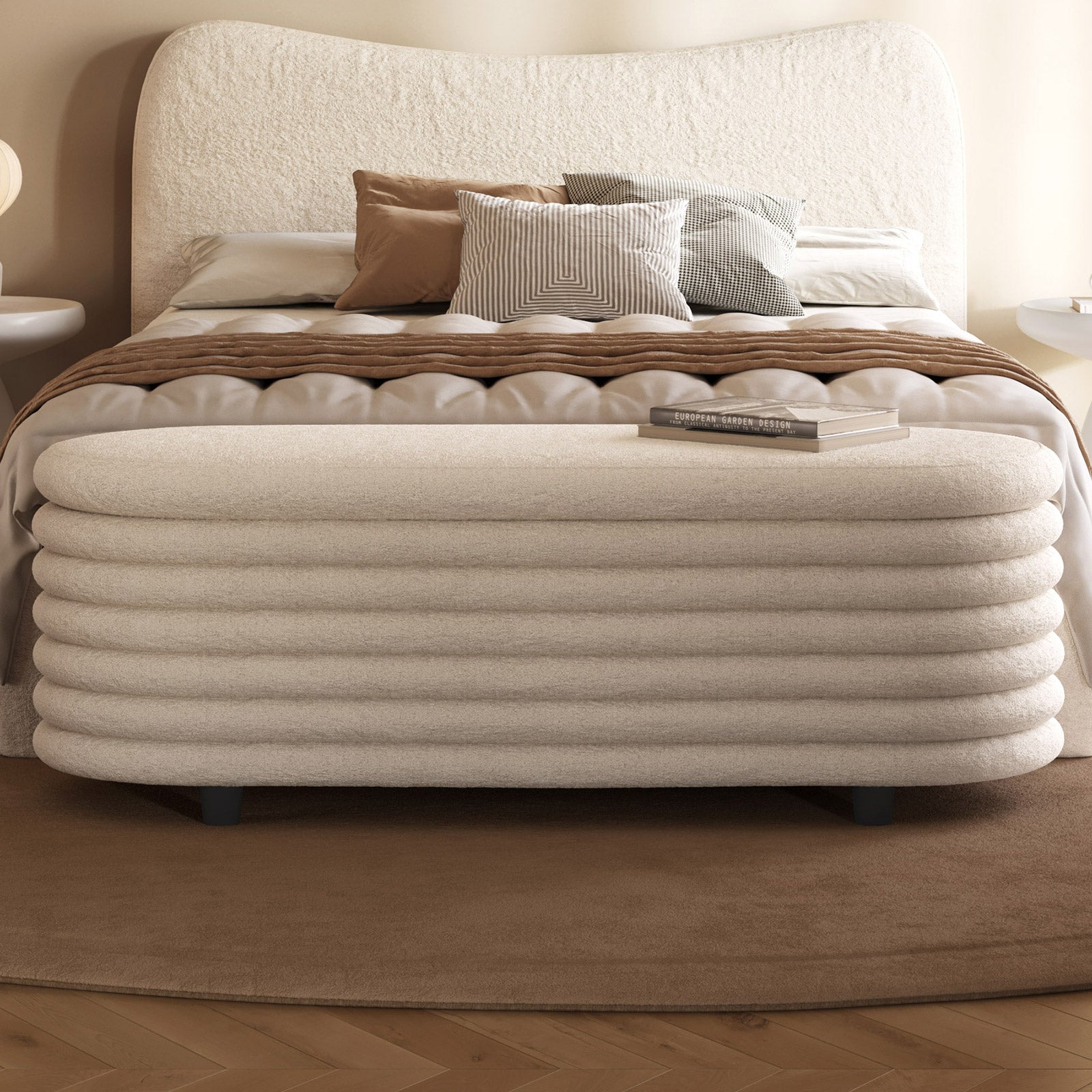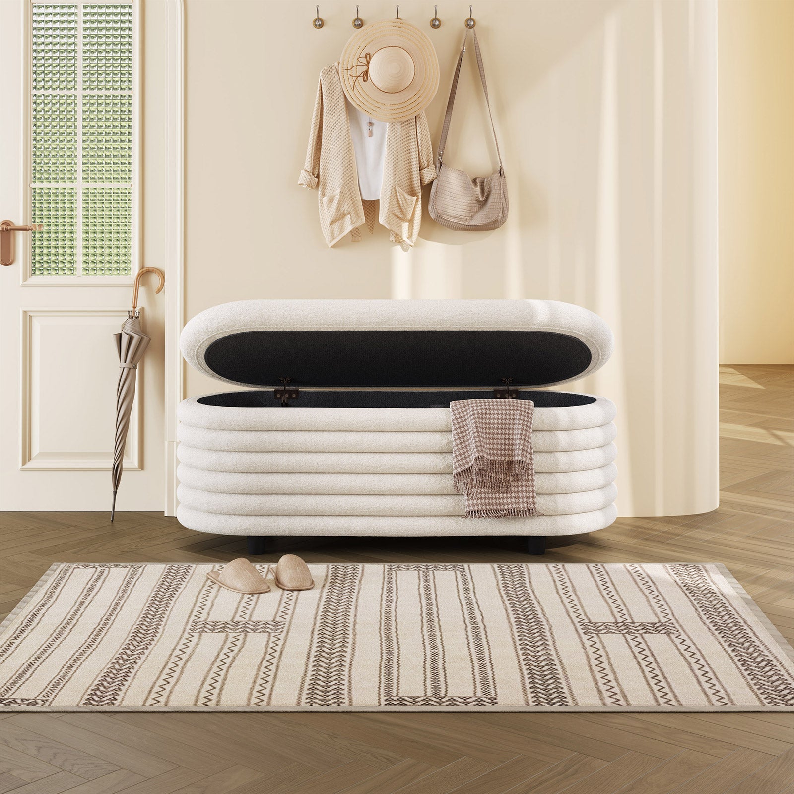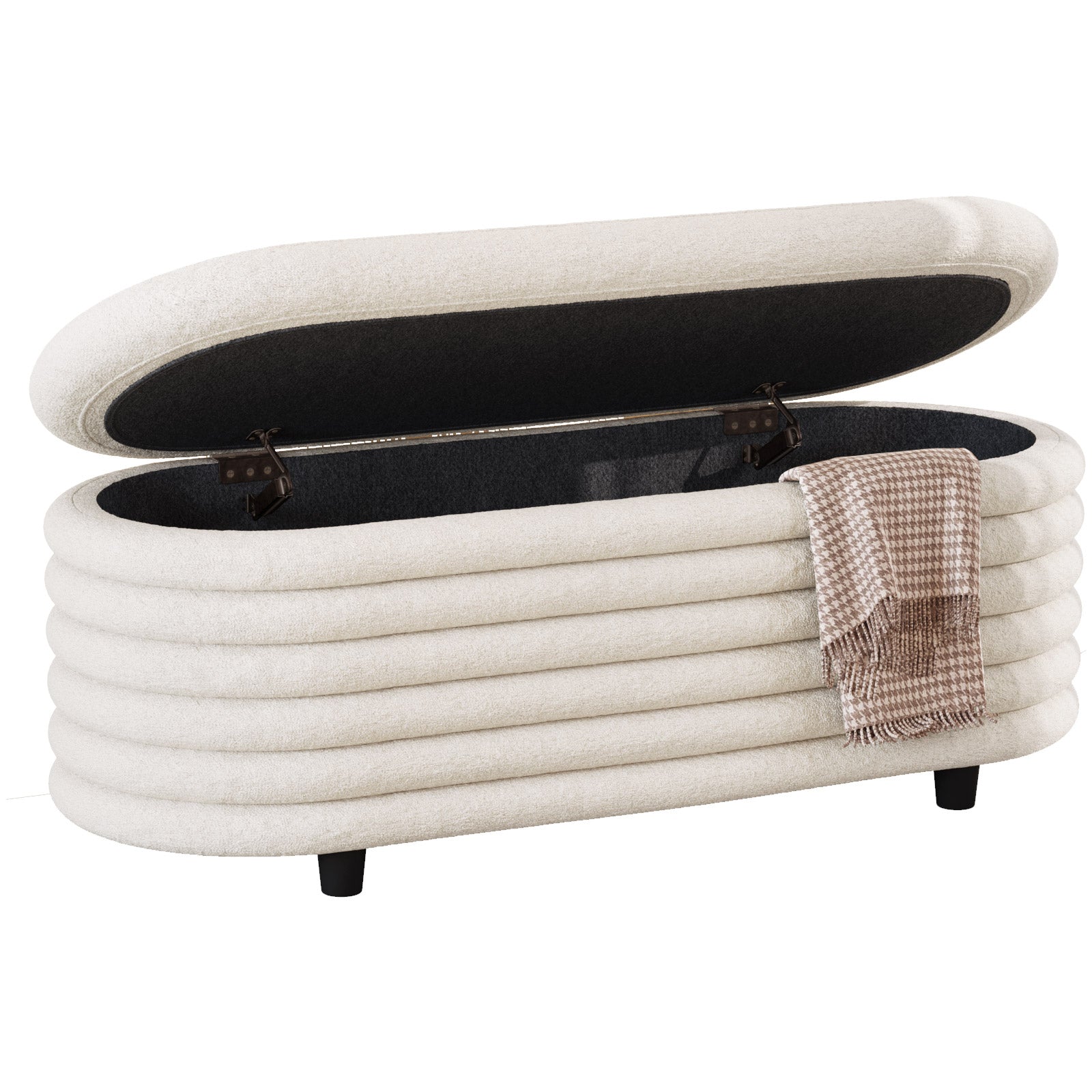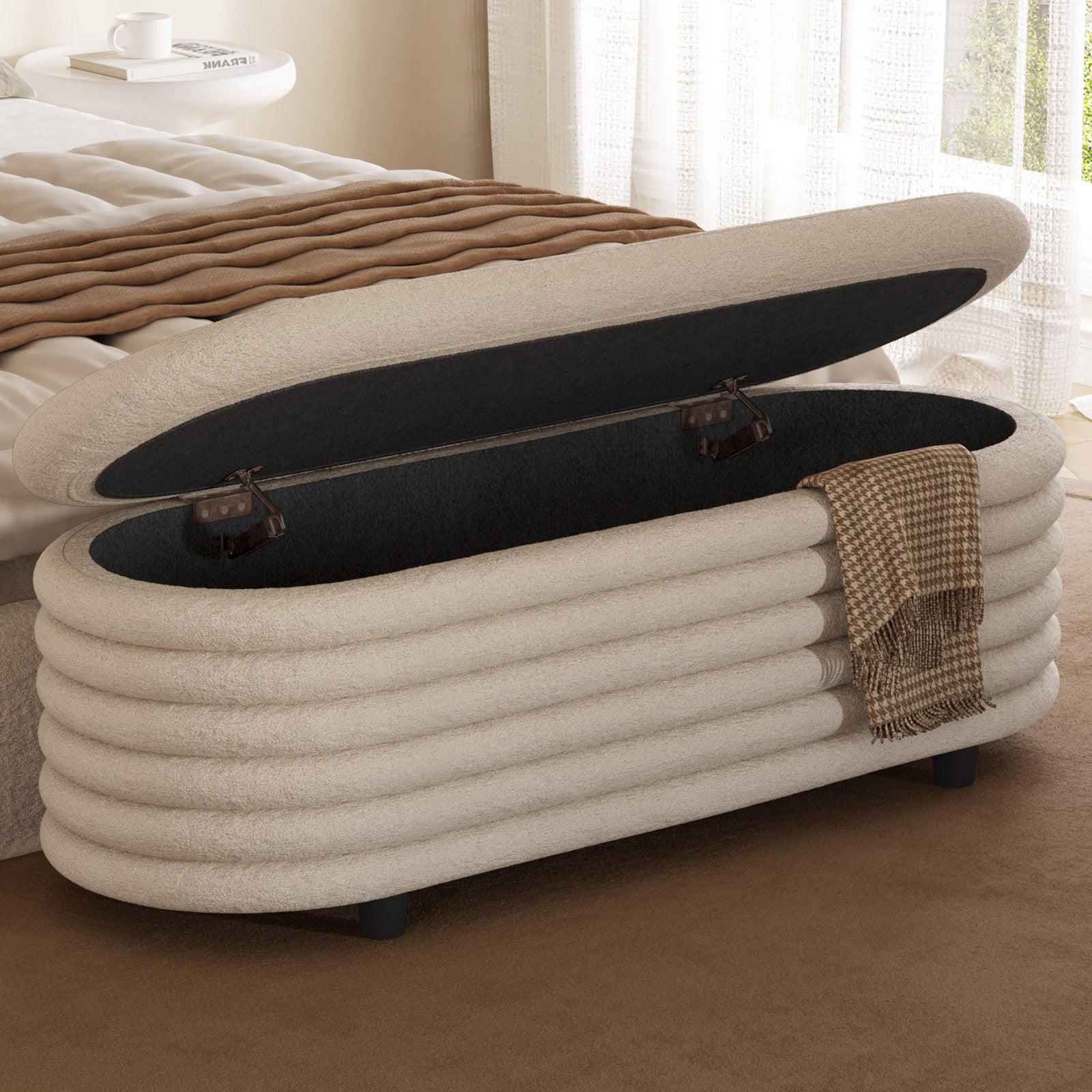 ✔ Hidden Storage Compartment — Flip open the safety-hinged lid to reveal a spacious interior, perfect for blankets, pillows, toys, or daily essentials. Keep your home organized without sacrificing style.