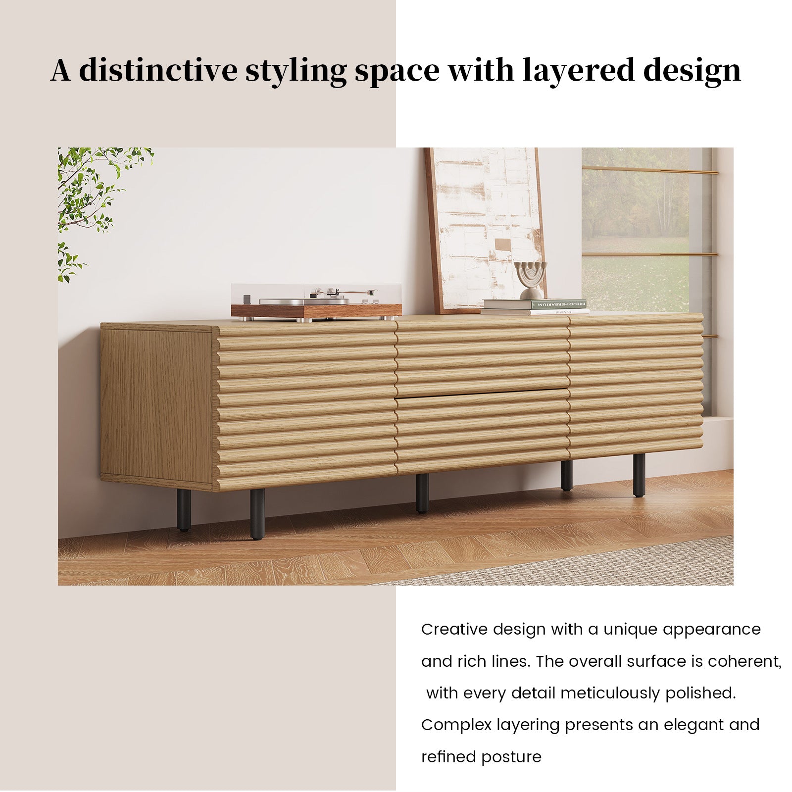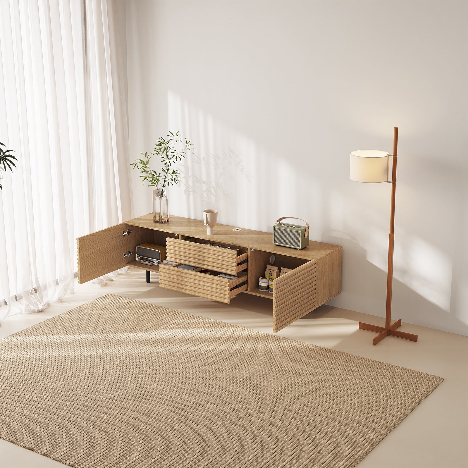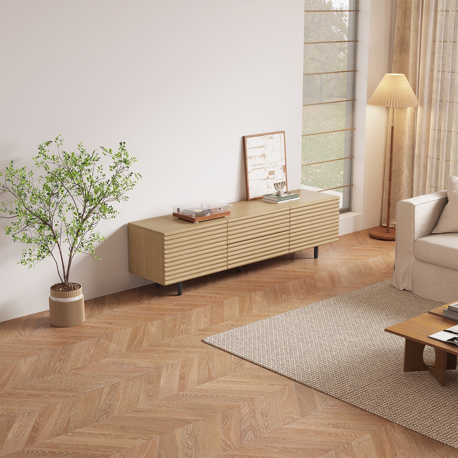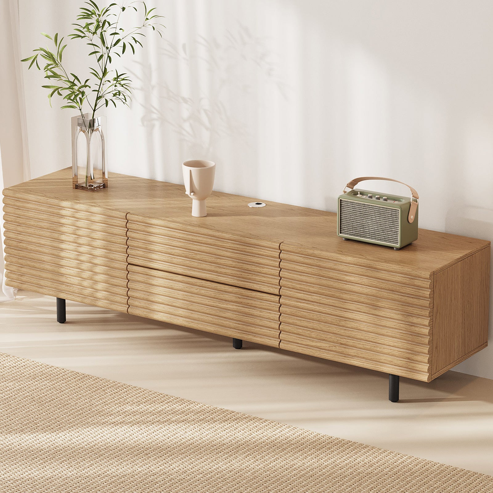 The Guyii modern TV stand is crafted from premium engineered wood with a natural wood finish. It features 2 cabinets and 2 storage drawers, offering ample space for organizing media players, consoles, and other essentials. Designed to support large TVs (45"-65"), this versatile console cabinet blends functionality and style, making it perfect for living rooms, bedrooms, or home entertainment areas.