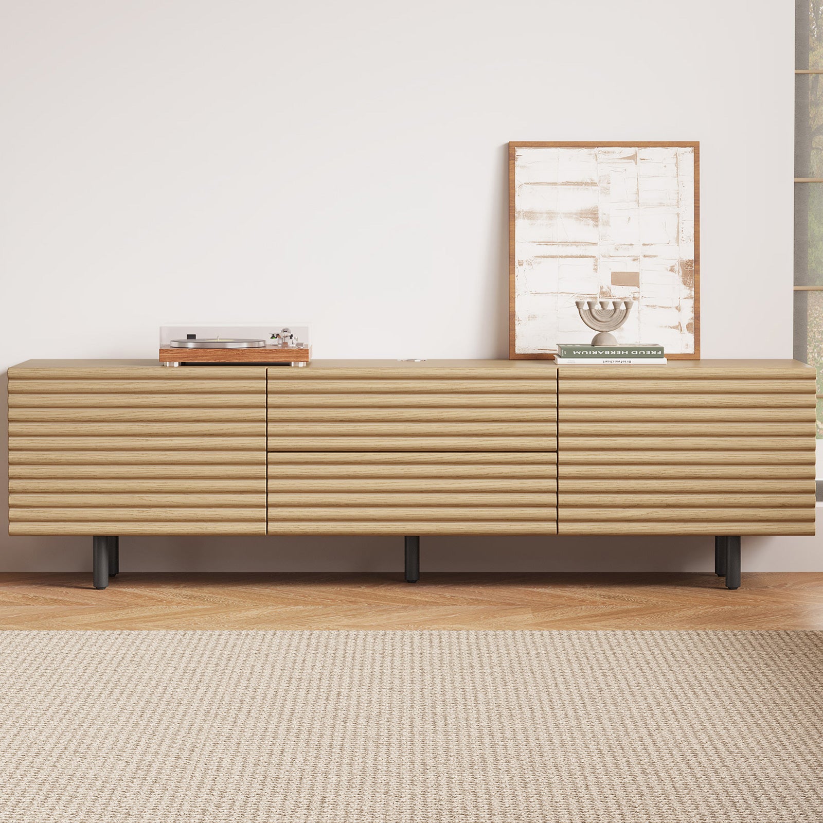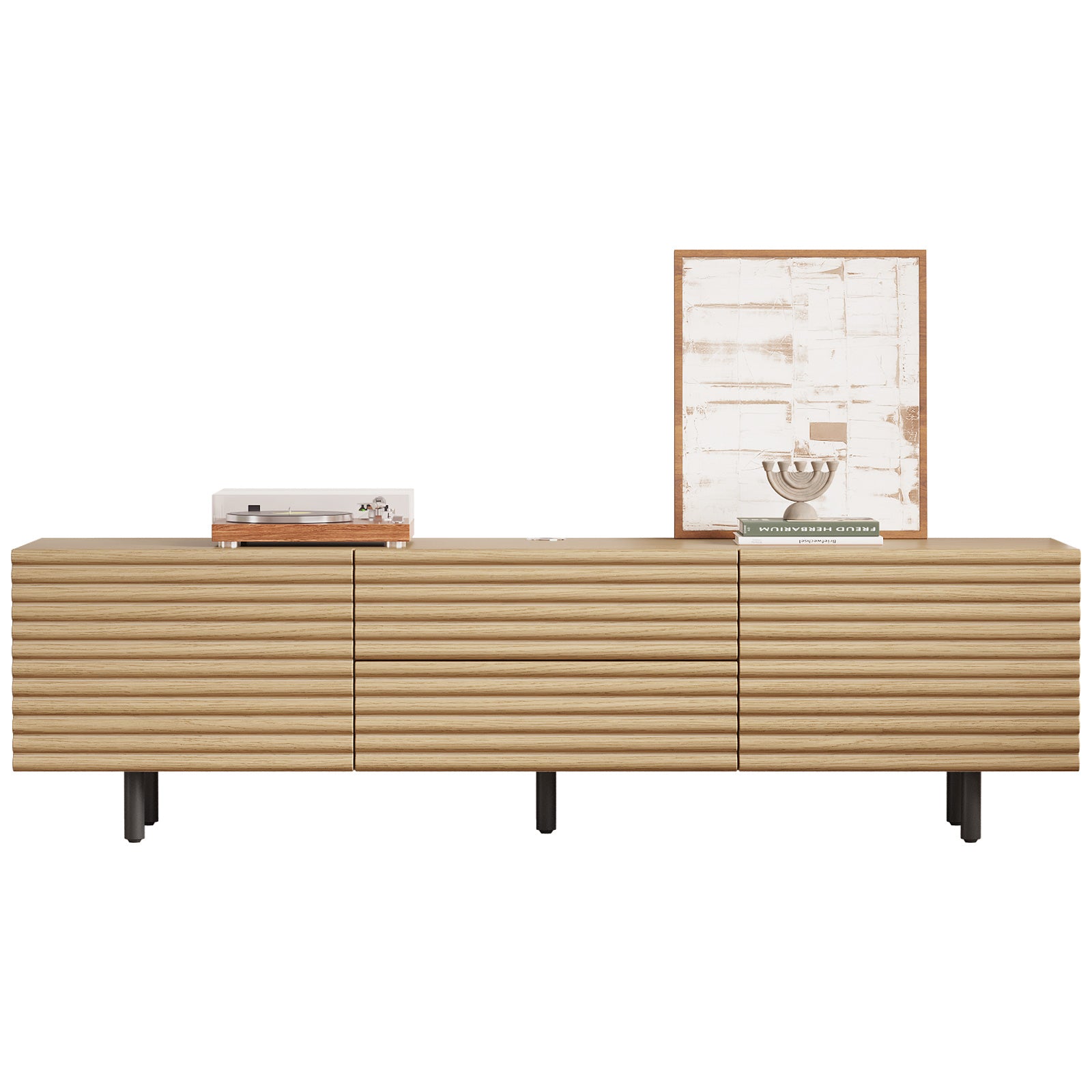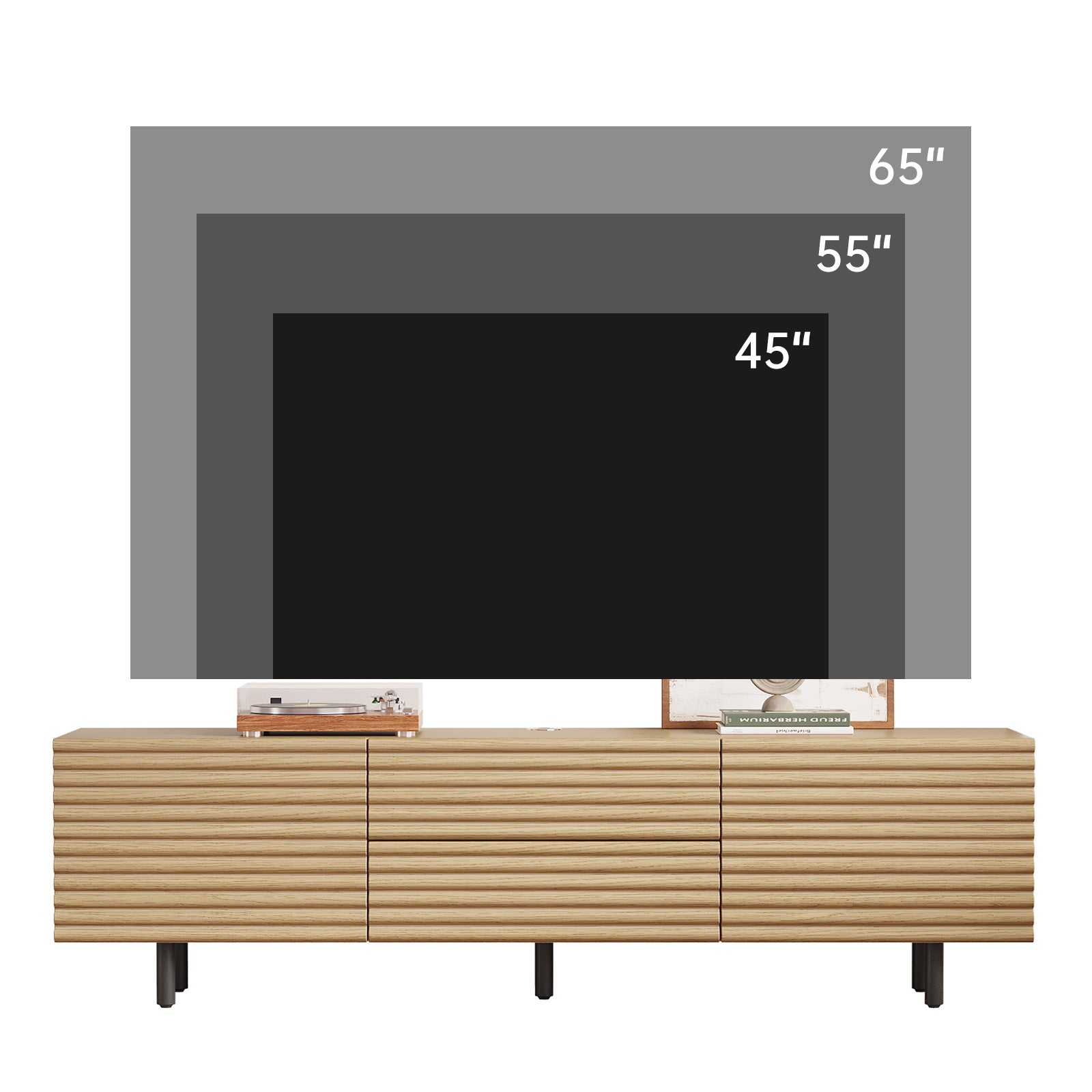 The Guyii modern TV stand is crafted from premium engineered wood with a natural wood finish. It features 2 cabinets and 2 storage drawers, offering ample space for organizing media players, consoles, and other essentials. Designed to support large TVs (45"-65"), this versatile console cabinet blends functionality and style, making it perfect for living rooms, bedrooms, or home entertainment areas.