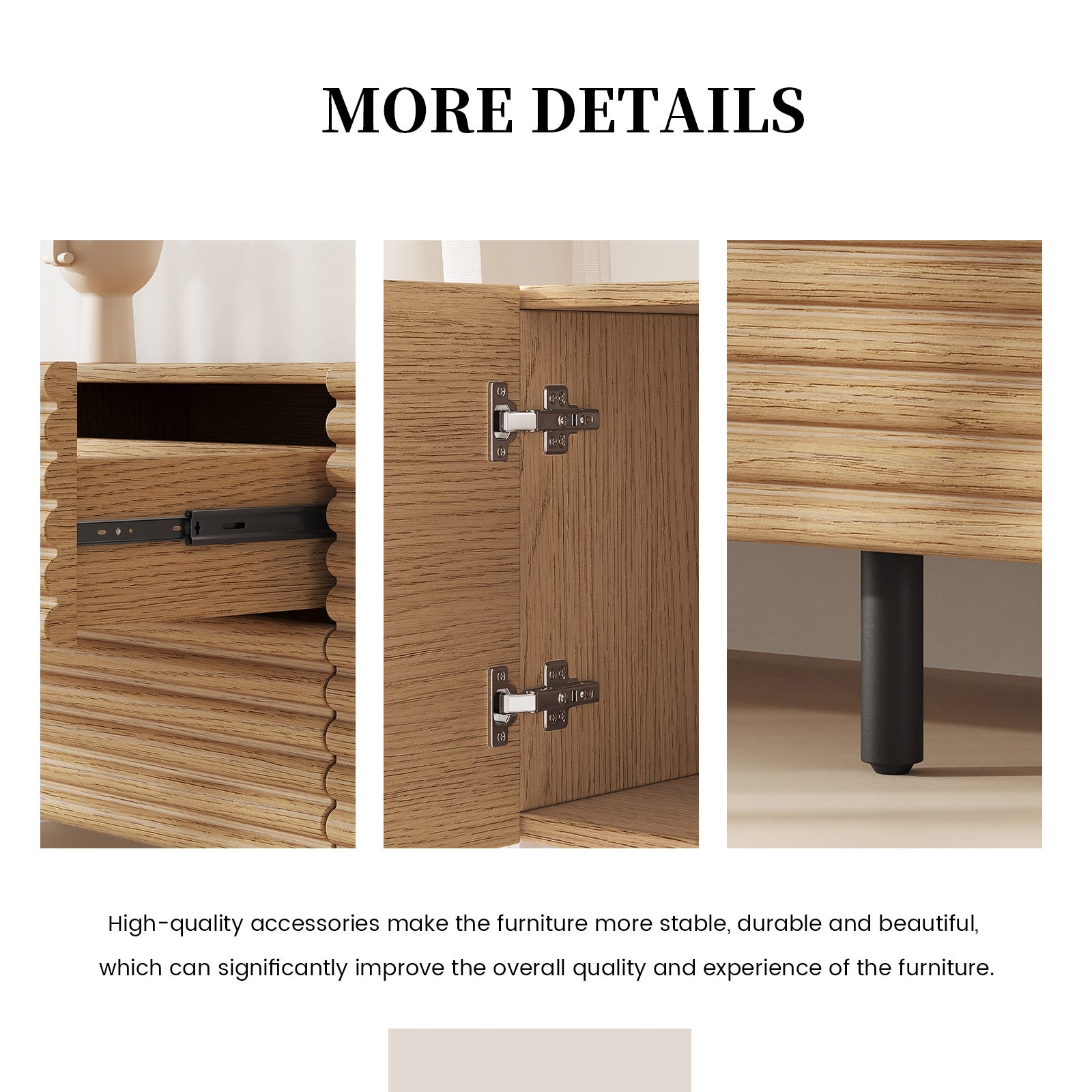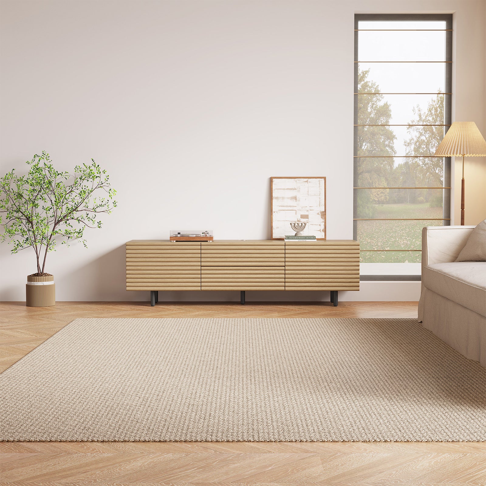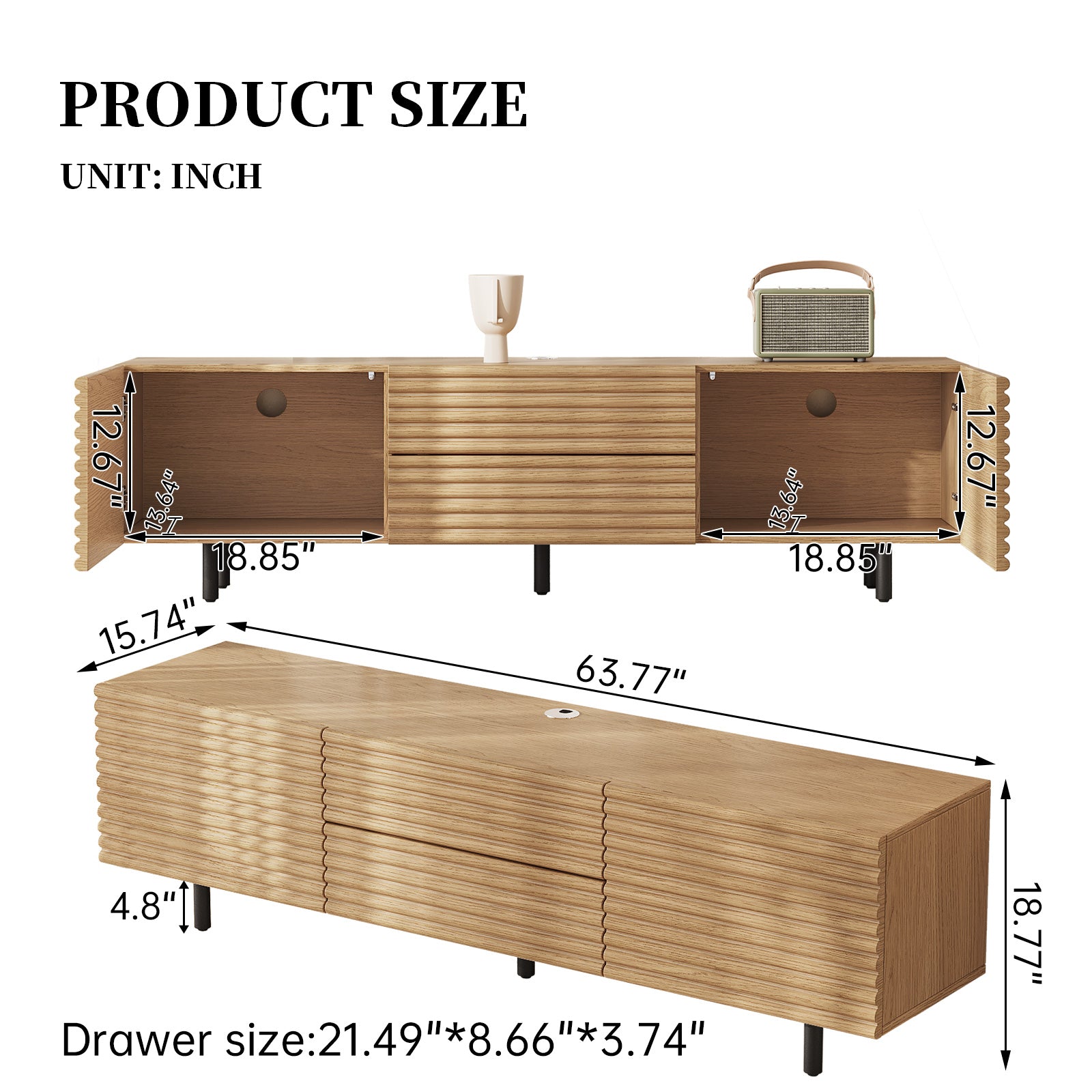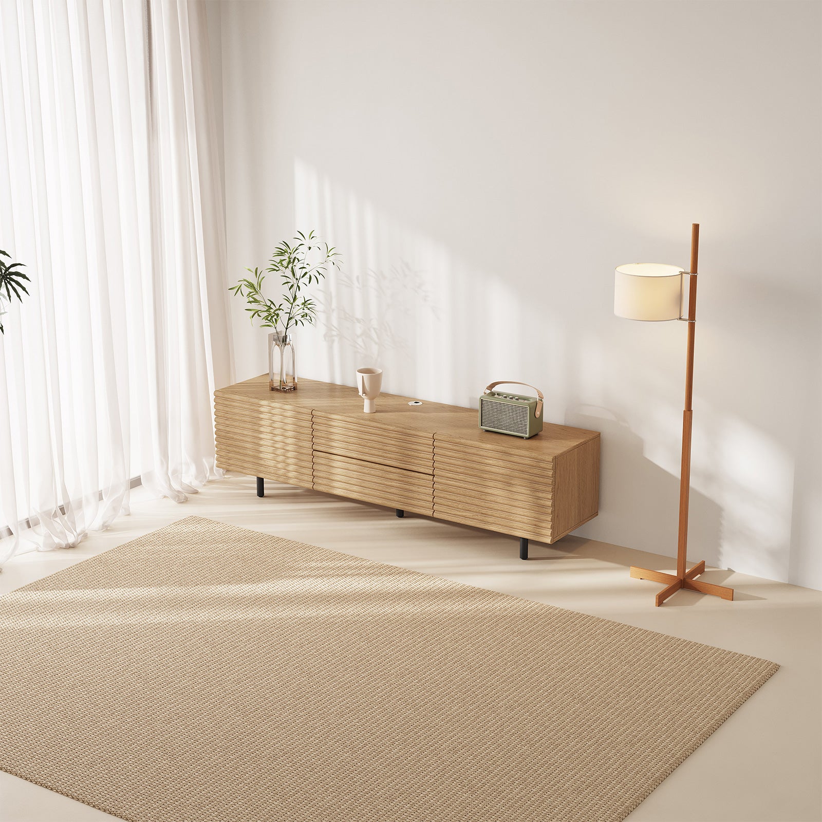 The Guyii modern TV stand is crafted from premium engineered wood with a natural wood finish. It features 2 cabinets and 2 storage drawers, offering ample space for organizing media players, consoles, and other essentials. Designed to support large TVs (45"-65"), this versatile console cabinet blends functionality and style, making it perfect for living rooms, bedrooms, or home entertainment areas.